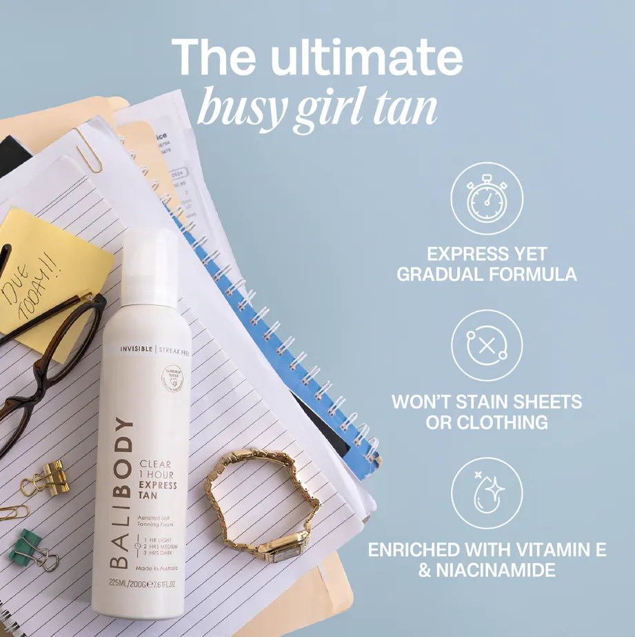 Bali Bodys Clear 1 Hour Express Self Tan giver en jævn, naturlig og strålende solkysset hud på rekordtid.