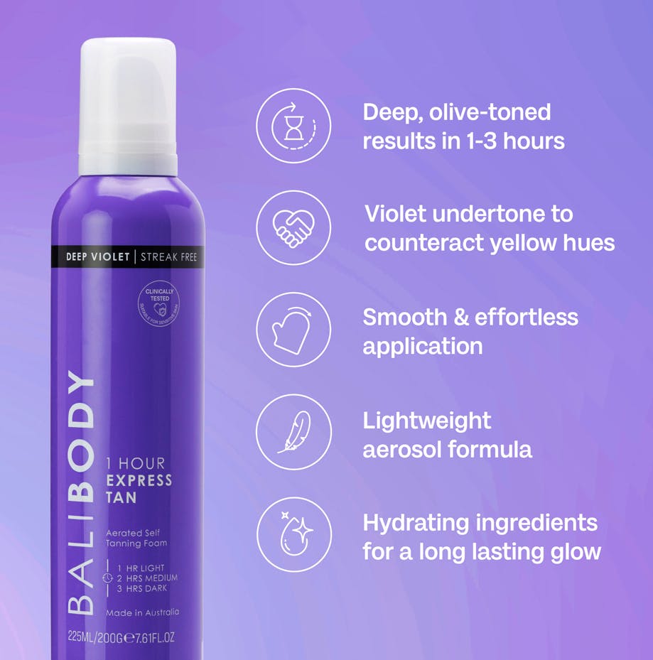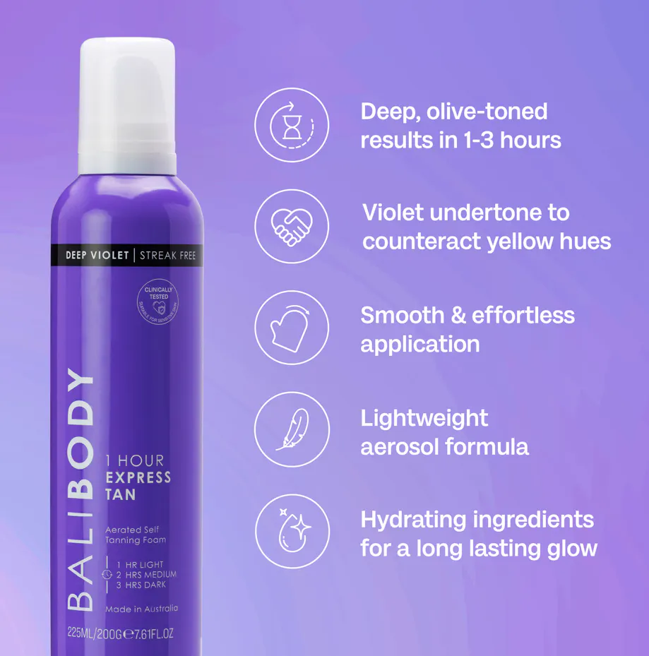 Opnå et dybt, rigt og oliventonet resultat på kort tid med Deep Violet Express Self Tan fra Bali Body. Den violetbaserede formel er udviklet til at neutralisere gule og orange undertoner og giver en dyb, naturlig olivenfarvet glød på så lidt som én time. Den avancerede expressformel er beriget med 100 procent naturlig DHA samt plejende ingredienser som glycerin, niacinamid og vitamin E. Pentavitin®, en moderne fugtforstærker, hjælper med at hydrere huden under udviklingstiden og bidrager til et mere jævnt og langvarigt resultat. Den lette og luftige mousse absorberes hurtigere end traditionelle selvbrunerprodukter og giver en hurtigtørrende, ikke klæbrig og transferresistent påføring for et jævnt og fejlfrit resultat hver gang. Farven er fuldt tilpasselig. Lad virke i 1 til 3 timer afhængigt af ønsket intensitet. Jo længere virketid, desto dybere og mørkere resultat, og produktet kan påføres i flere lag for at opbygge farven yderligere. Perfekt til dig, der ønsker en rig, chokoladebrun tone med dybe olivenundertoner. Velegnet til alle hudtyper, inklusive sensitiv hud.
