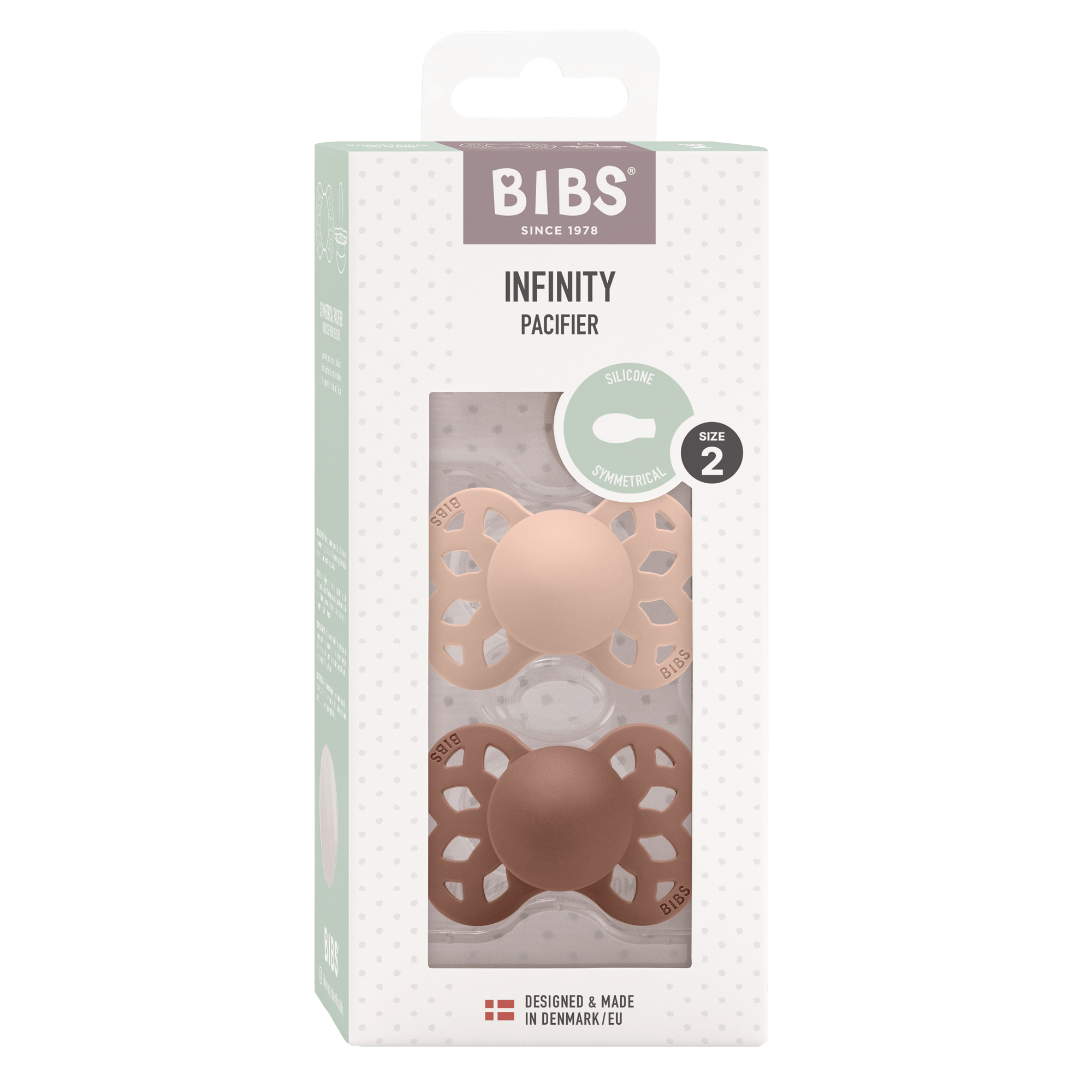 Infinity 2 Pack Silicone Symmetrical Size 2 Blush/Woodchuck er en fantastisk sut fra det populære mærke BIBS.