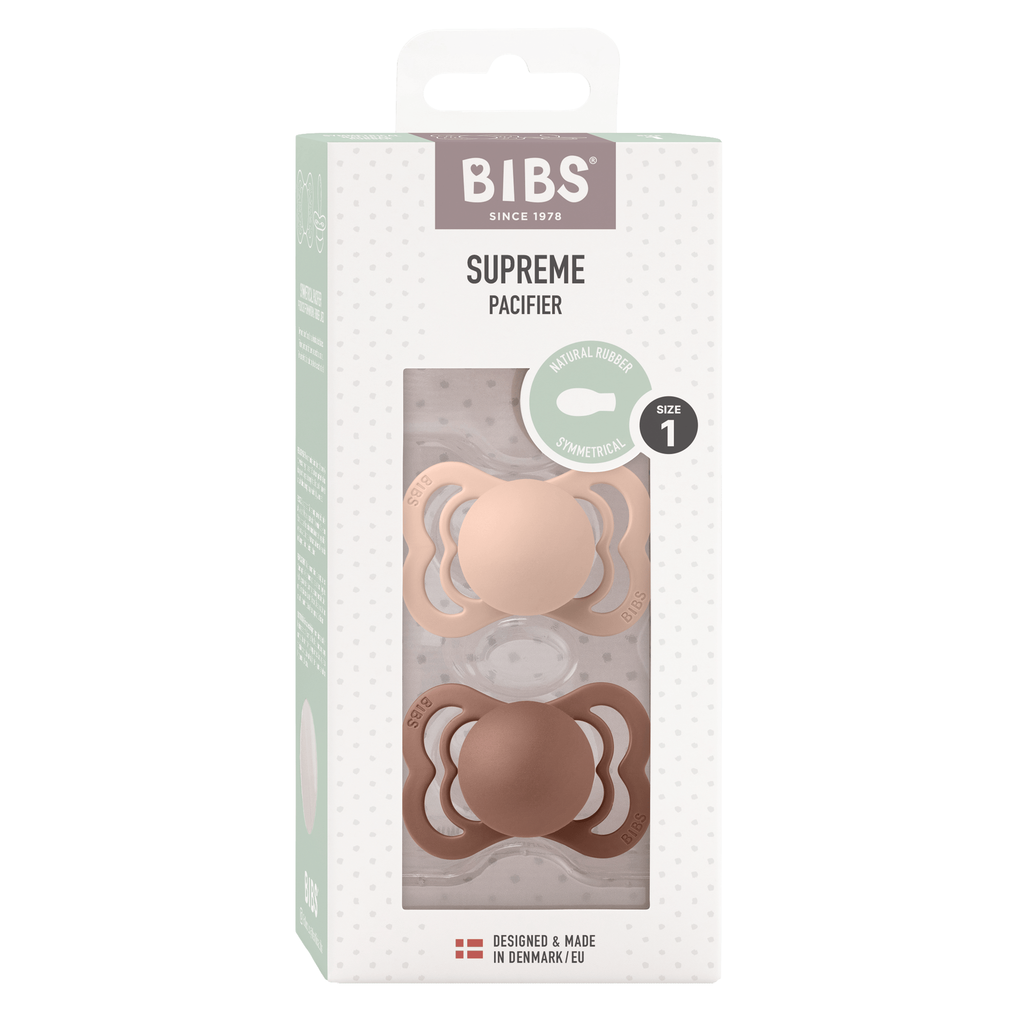 BIBS Supreme 2 Pack Latex Size 1 Woodchuck/Blush er den perfekte sut til dit barns behov.