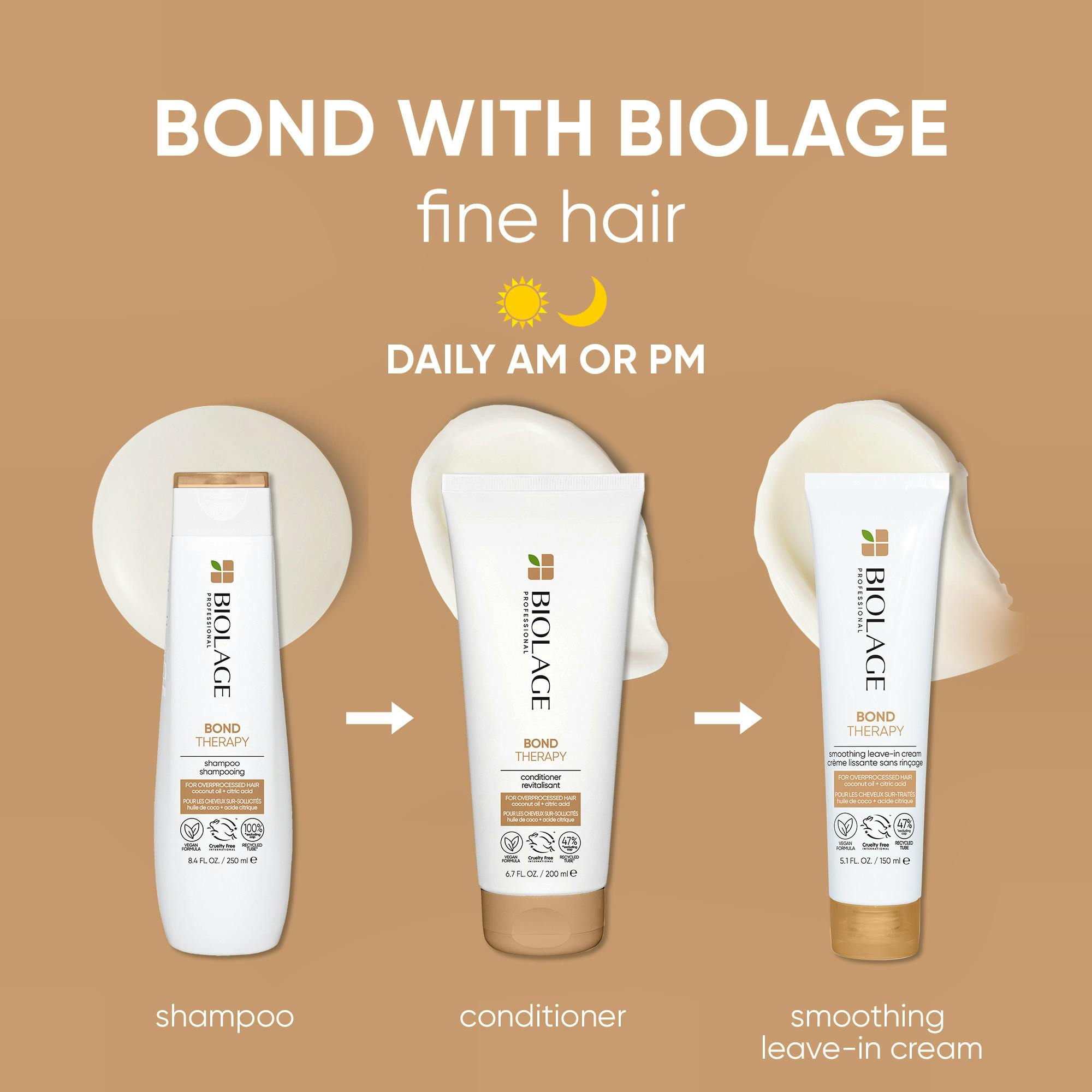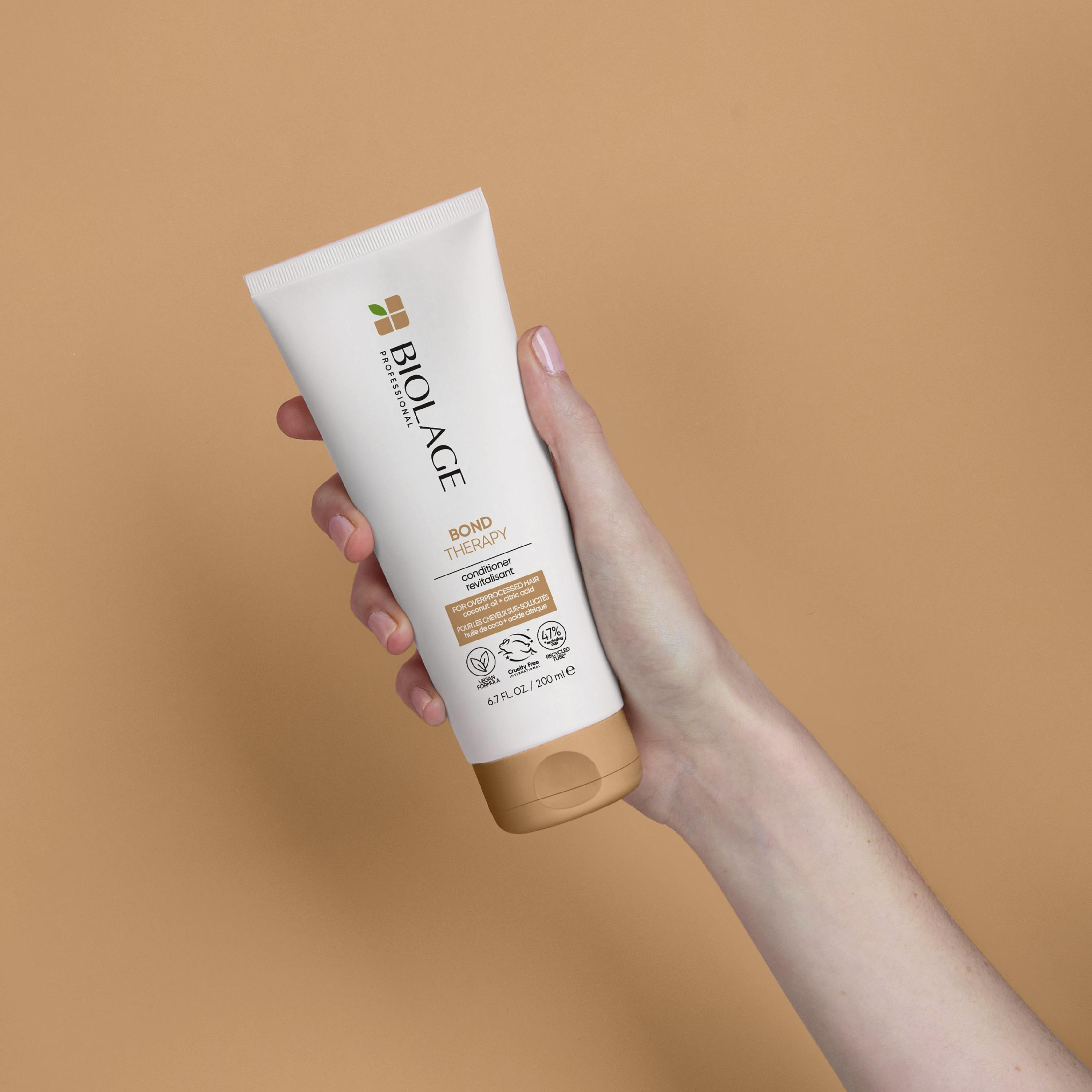 Bond Therapy Conditioner fra Biolage reducerer anallet af knækkede hår og hjælper med at forbedre medgørligheden* Denne lotion-agtige formel distribueres gennem håret; nærer* og hjælper med at udrede håret på en nem måde. Formel med kokosolie hjælper med at nære håret*, og citronsyre forstærker svage bindinger og hjælper med at forbedre styrke og spændstighed* *Instrumental test: Bond Therapy Shampoo og Conditioner vs. ikke-plejende shampoo