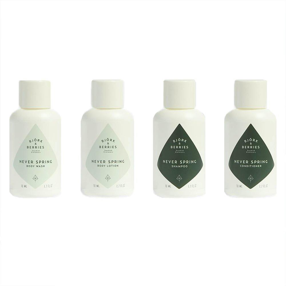 Dette essentielle rejsesæt indeholder en shampoo, balsam, shower gel og en body lotion på 50 ml. Never Spring -serien er inspireret af forår og de første blomsterknopper, som skubber sig op af jorden. Du kan emme duftnoter af citrus, fersken, jasmin, cedertræ, musk og amber. Alle ingredienser er hudvenlige og beriget med antioxidanter samt vitaminer.