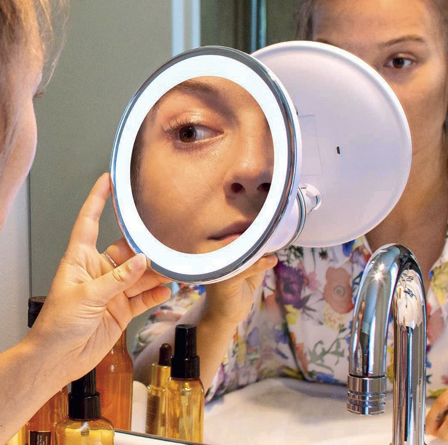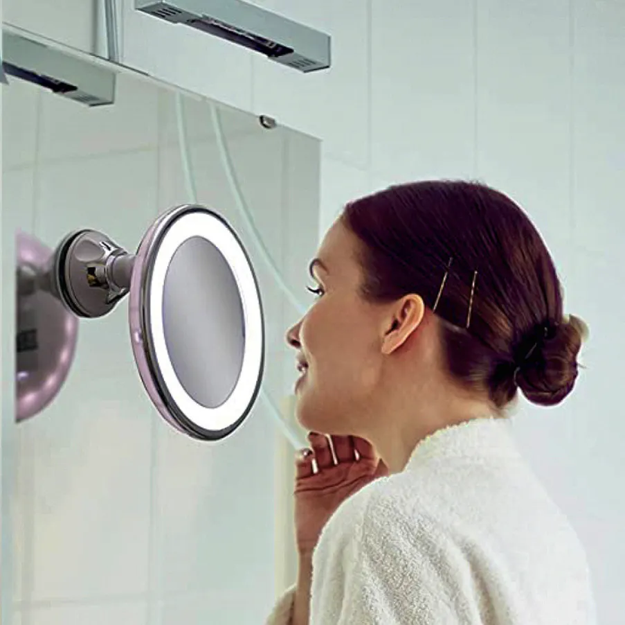 Stilrent makeupspejl / barberingsspejl med 10x forstørrelse og indbygget LED-belysning, der kan justeres.