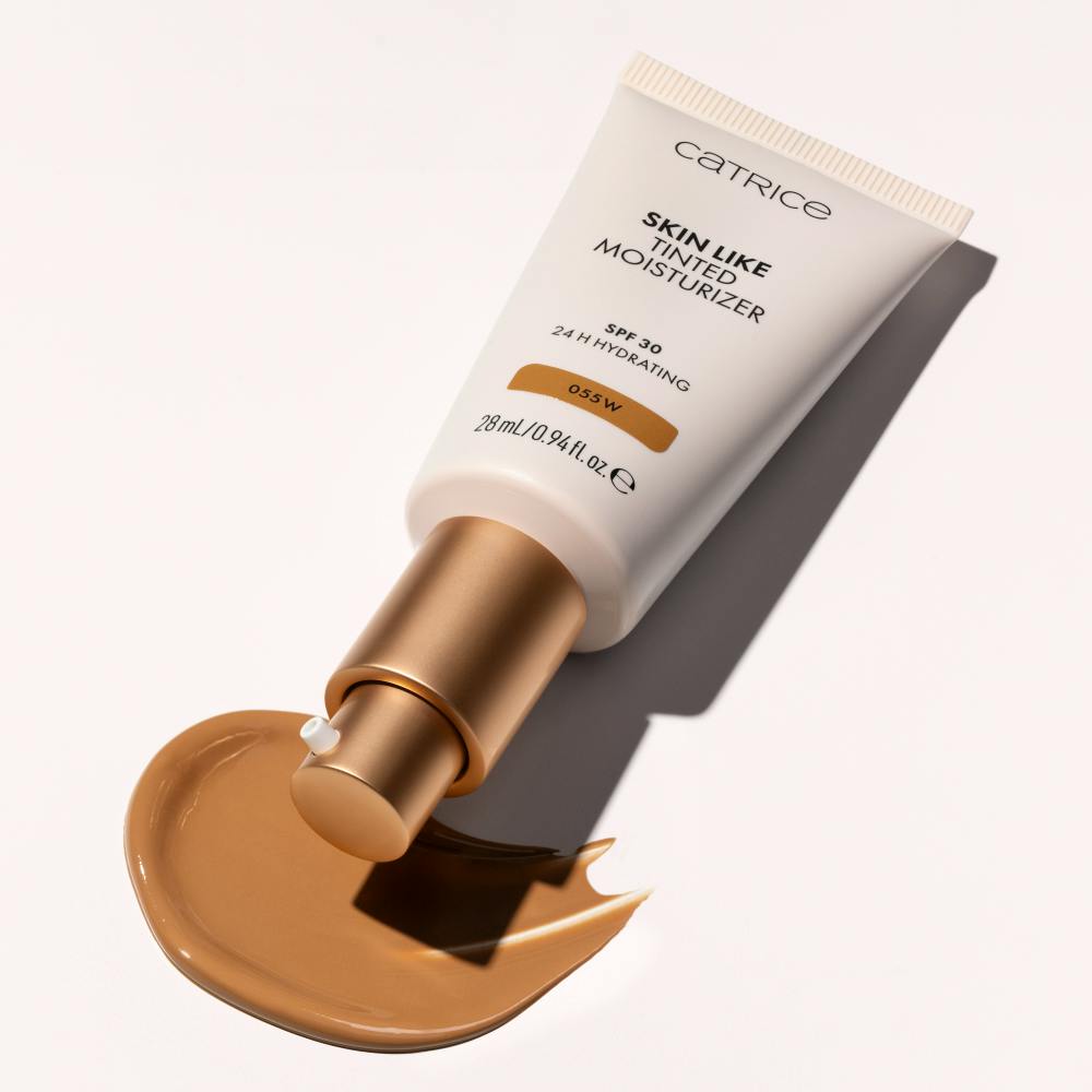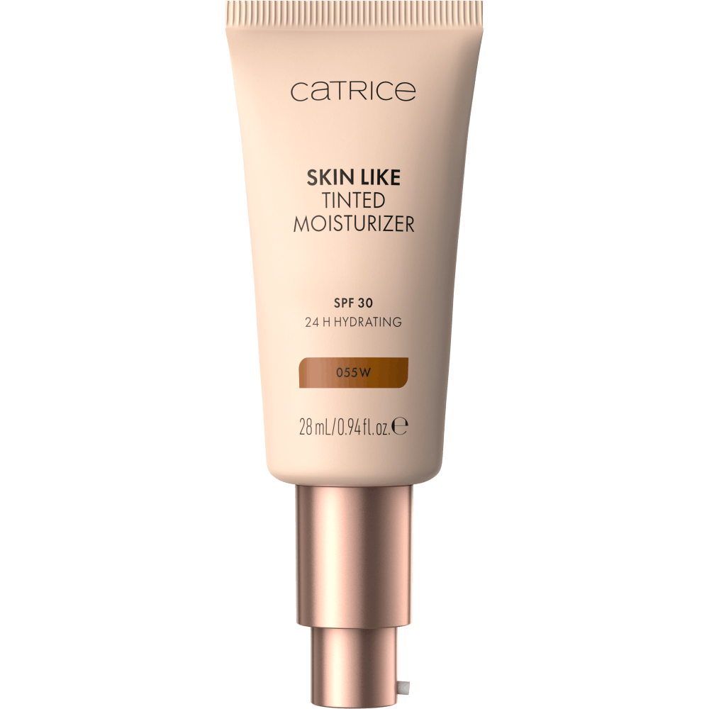 Mød din nye go-to for en naturlig teint hver dag: Catrice Skin Like Tinted Moisturizer 055W i en medium solbrun nuance med varme gule undertoner.