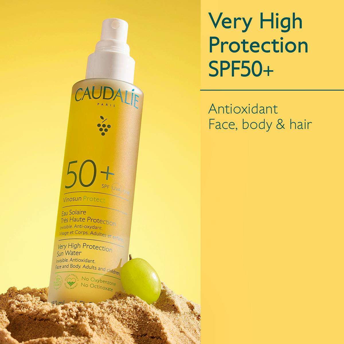 Vinosun Very High Protection Sun Water SPF50+ giver ansigt, krop og hår effektiv beskyttelse mod UVA/UVB-stråler og har også en antioxidativ effekt for at beskytte den mest sensitive hud.