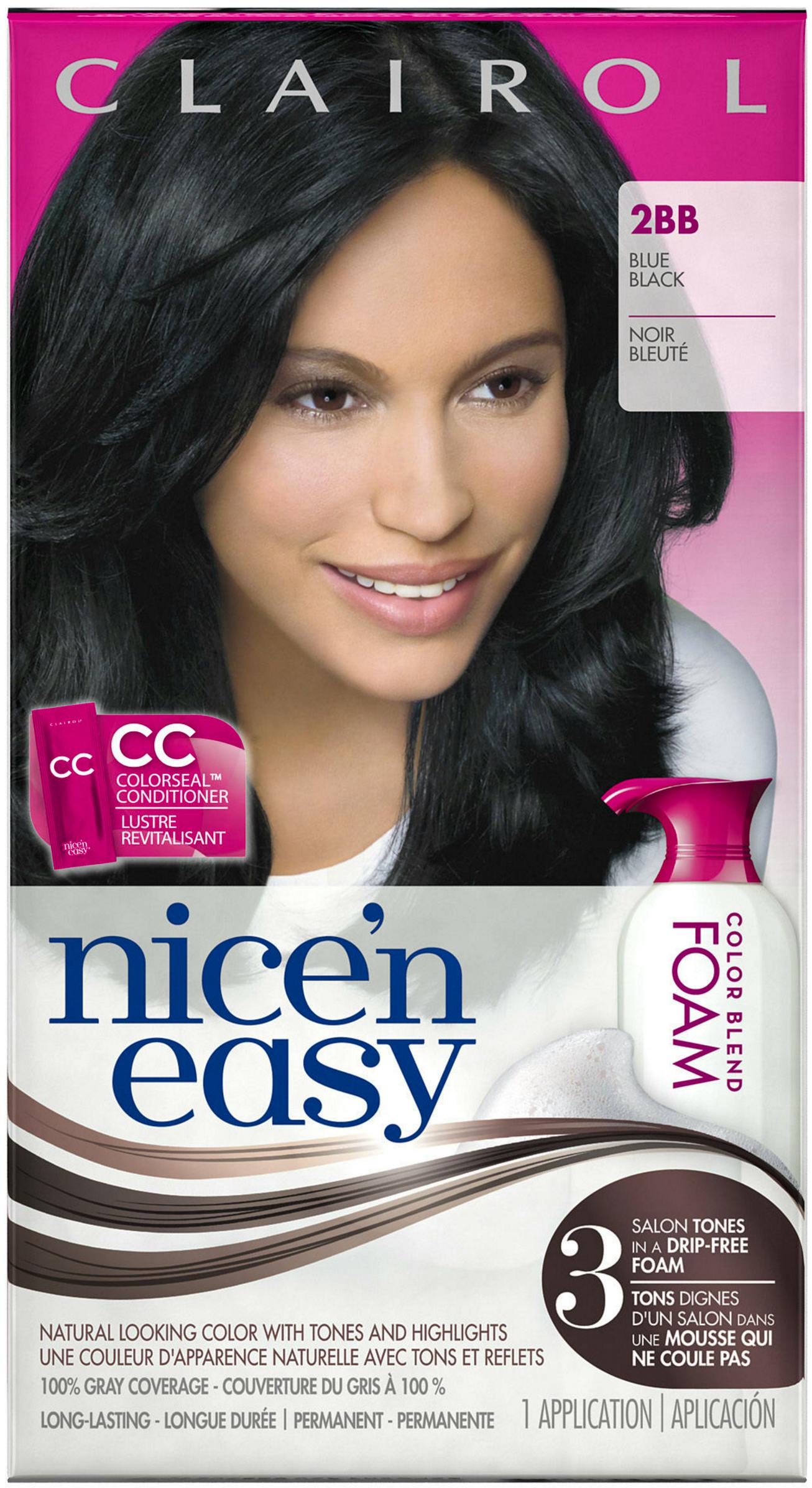 Nice 'n' Easy Colour Blend Foam fra Clairol er en permanent hårfarve i smart skumform, så den ikke drypper og er supernem at påføre i håret. Nice 'n' Easy Colour Blend Foam 2BB Blue Black er en blåsort farve som 100% dækker grå hår. Med Nice 'n' Easy Colour Blend Foam får du en farve der holder længe, ser naturlig ud og indeholder en efterbehandling til det nyfarvede hår.