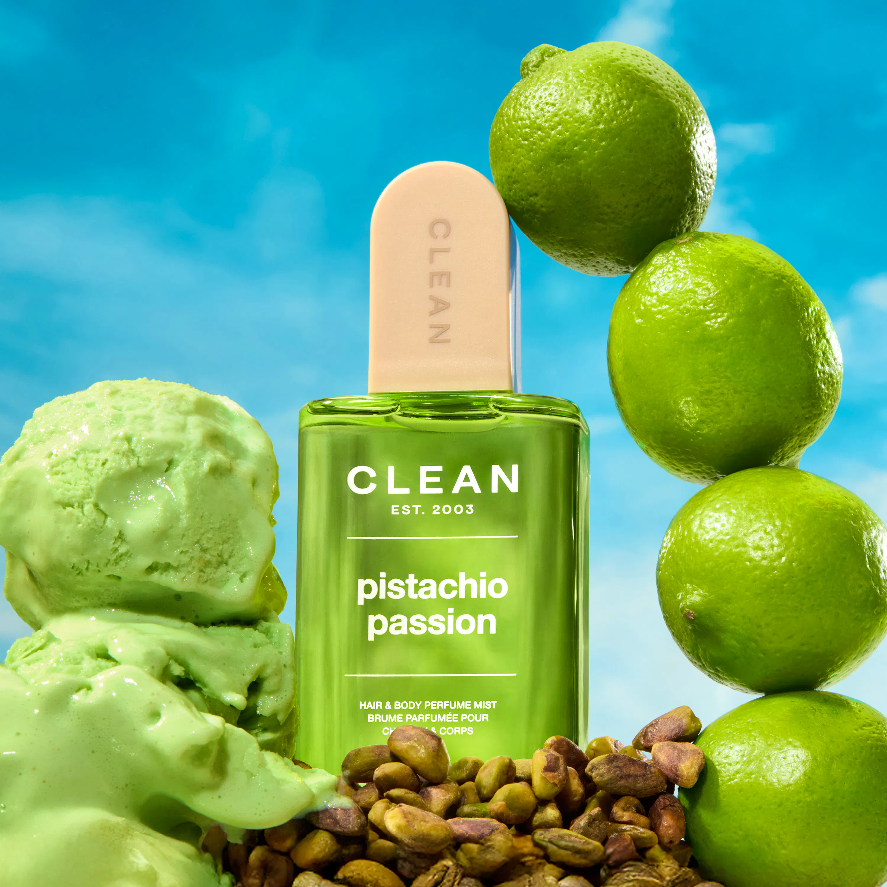 CLEAN Pistachio Passion Hair & Body Perfume Mist balancerer det cremede med det sprudlende – en duft, der føles som en lille hemmelig nydelse, du ikke behøver at dele med nogen.