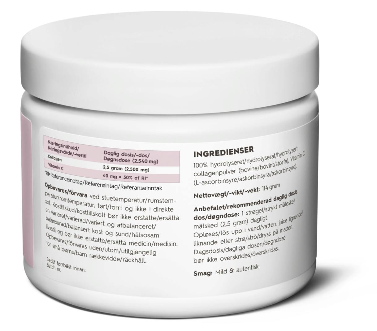 Hydrolyseret Collagen pulver (bovine), collagen peptider, Vitamin-C (L-ascorbinsyre).