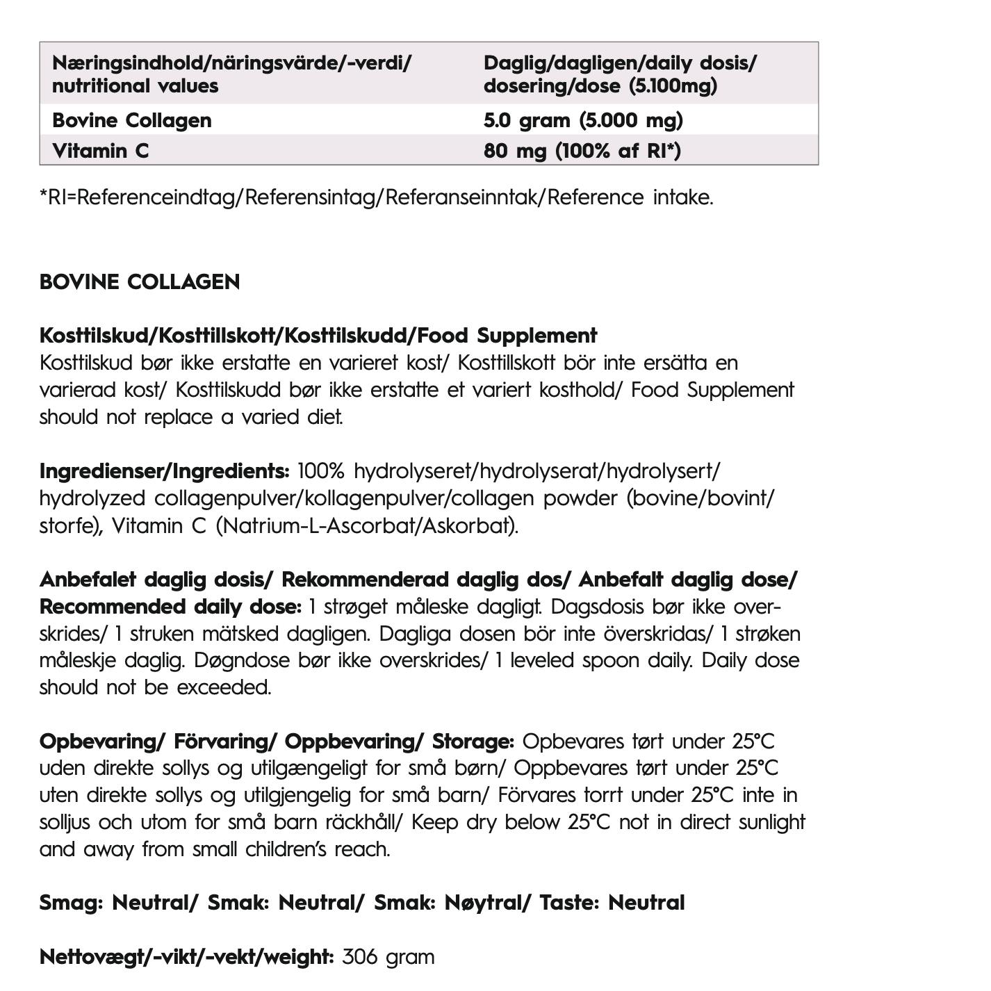 100% hydrolyseret/hydrolyserat/hydrolysert/hydrolyzed collagenpulver/ kollagenpulver/collagen powder (bovine/bovint/storfe), Vitamin C (Natrium-L-Ascorbat/Askorbat).