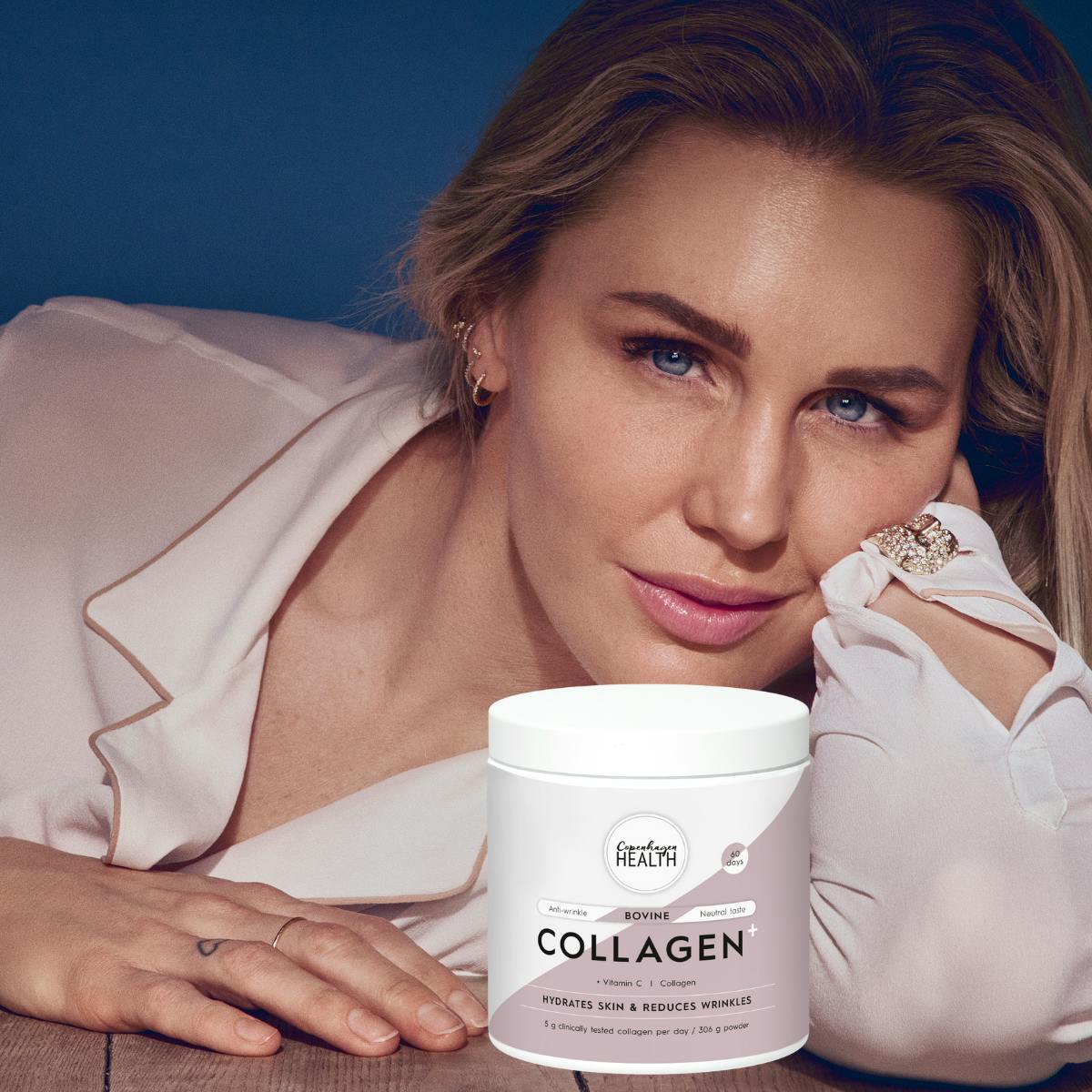 Collagen+ fra Copenhagen Health består af 100% hydrolyseret bovinekollagen (kvæg), som reducerer rynker og fine linjer.