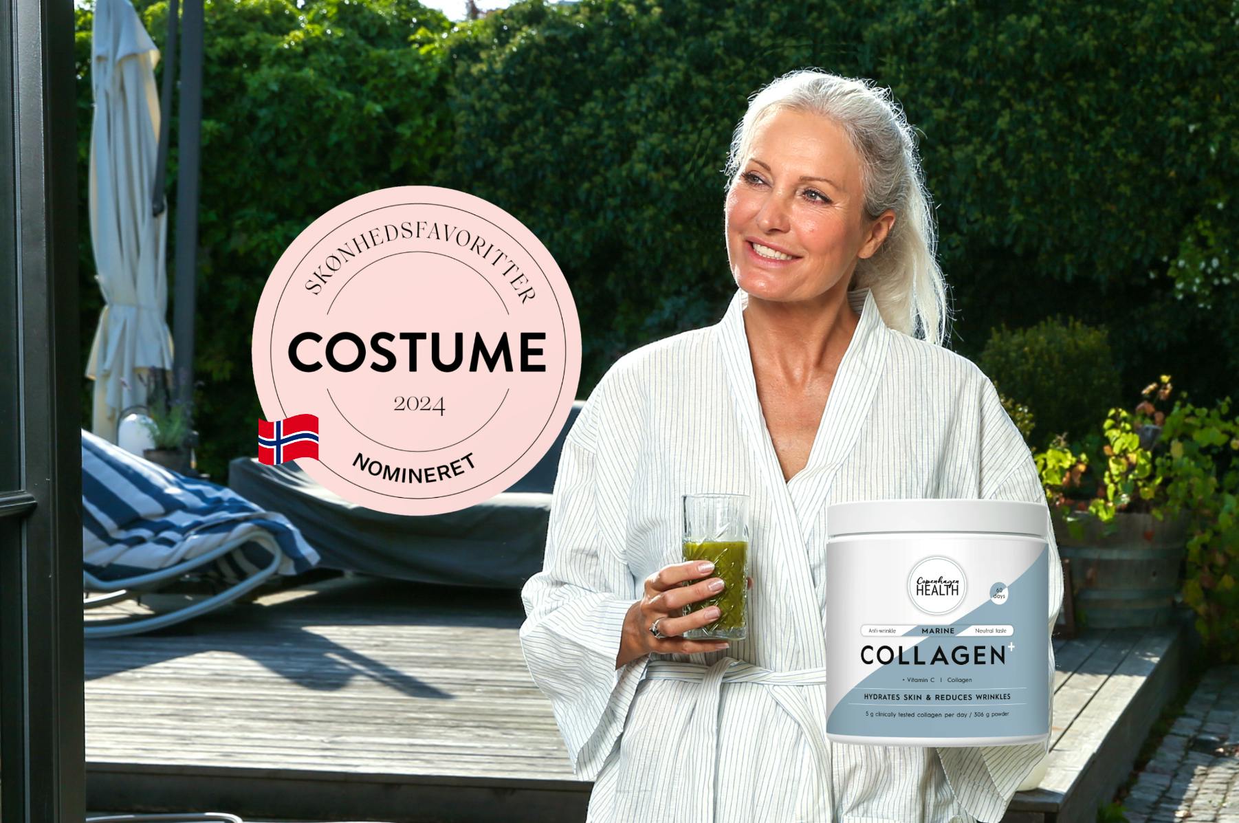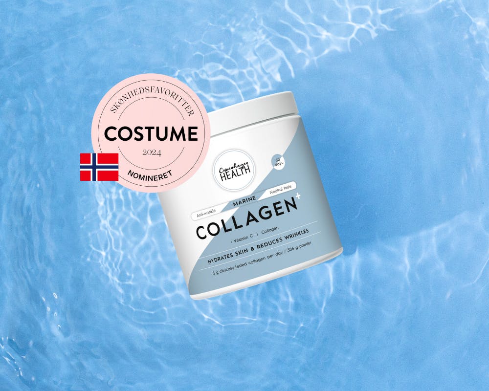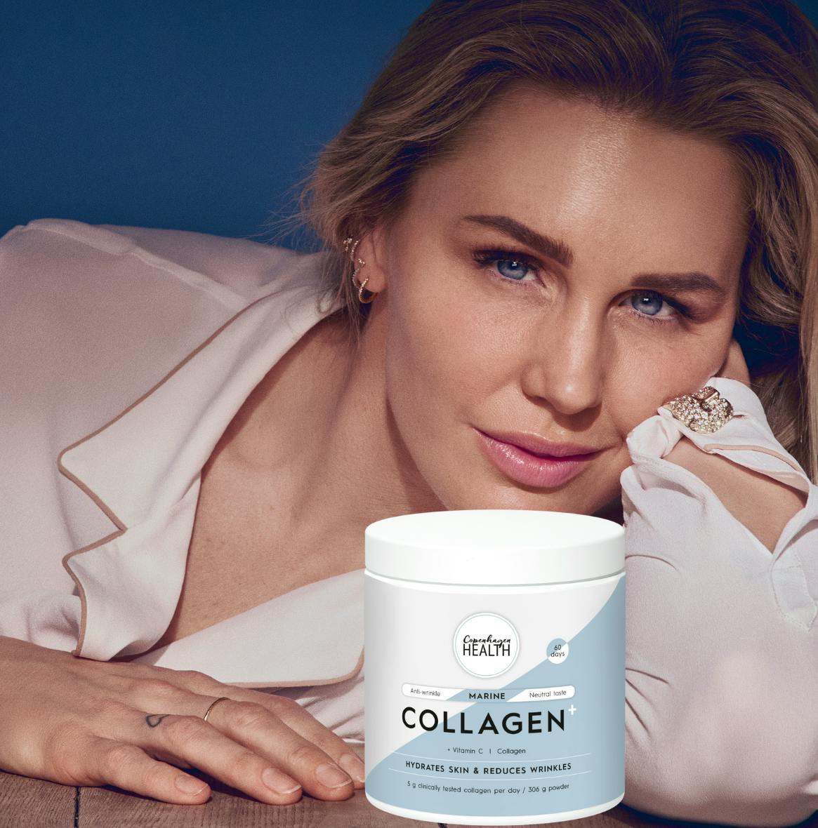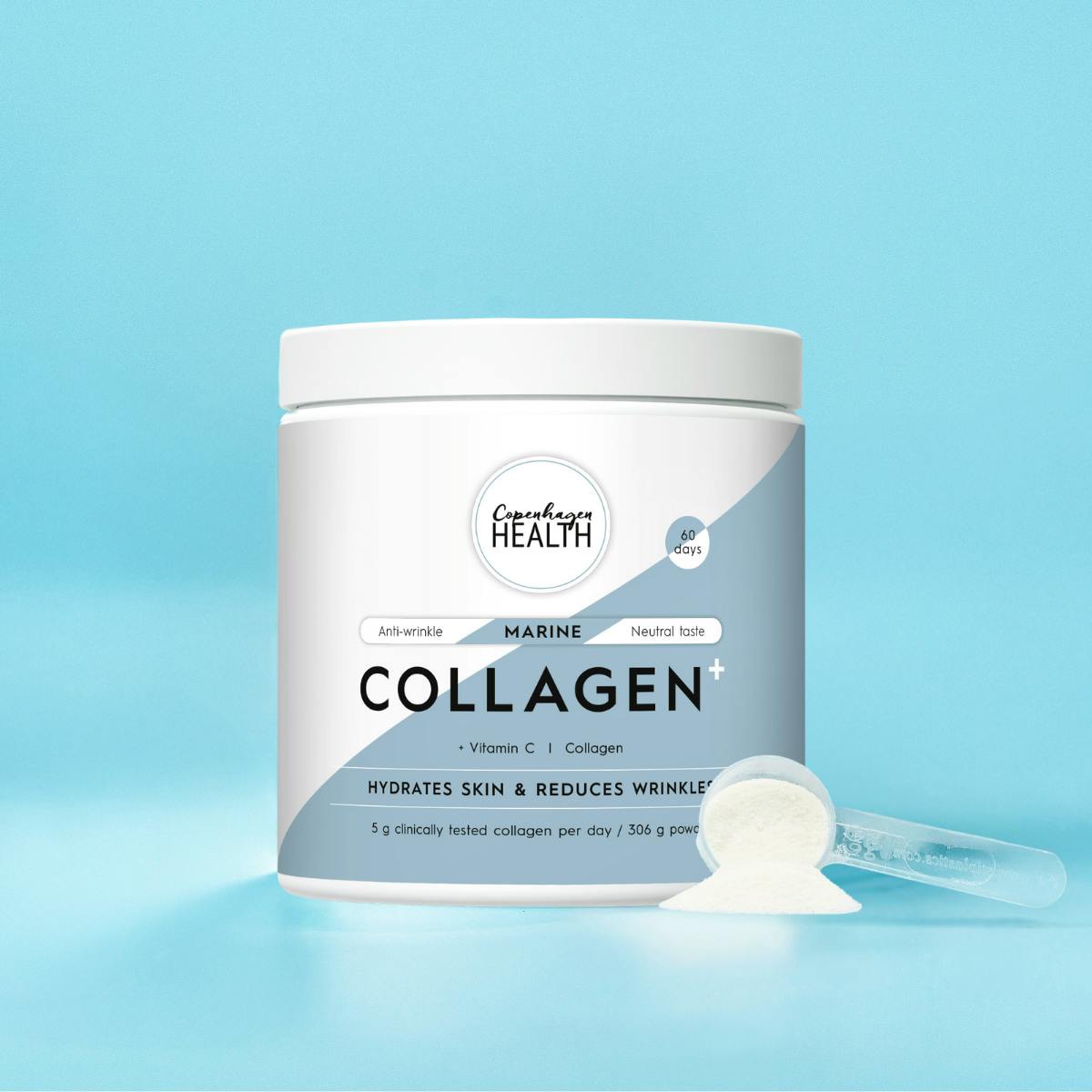 Marine Collagen+ fra Copenhagen Health består af 100% hydrolyseret marinekollagen (fisk), som reducerer rynker og fine linjer.