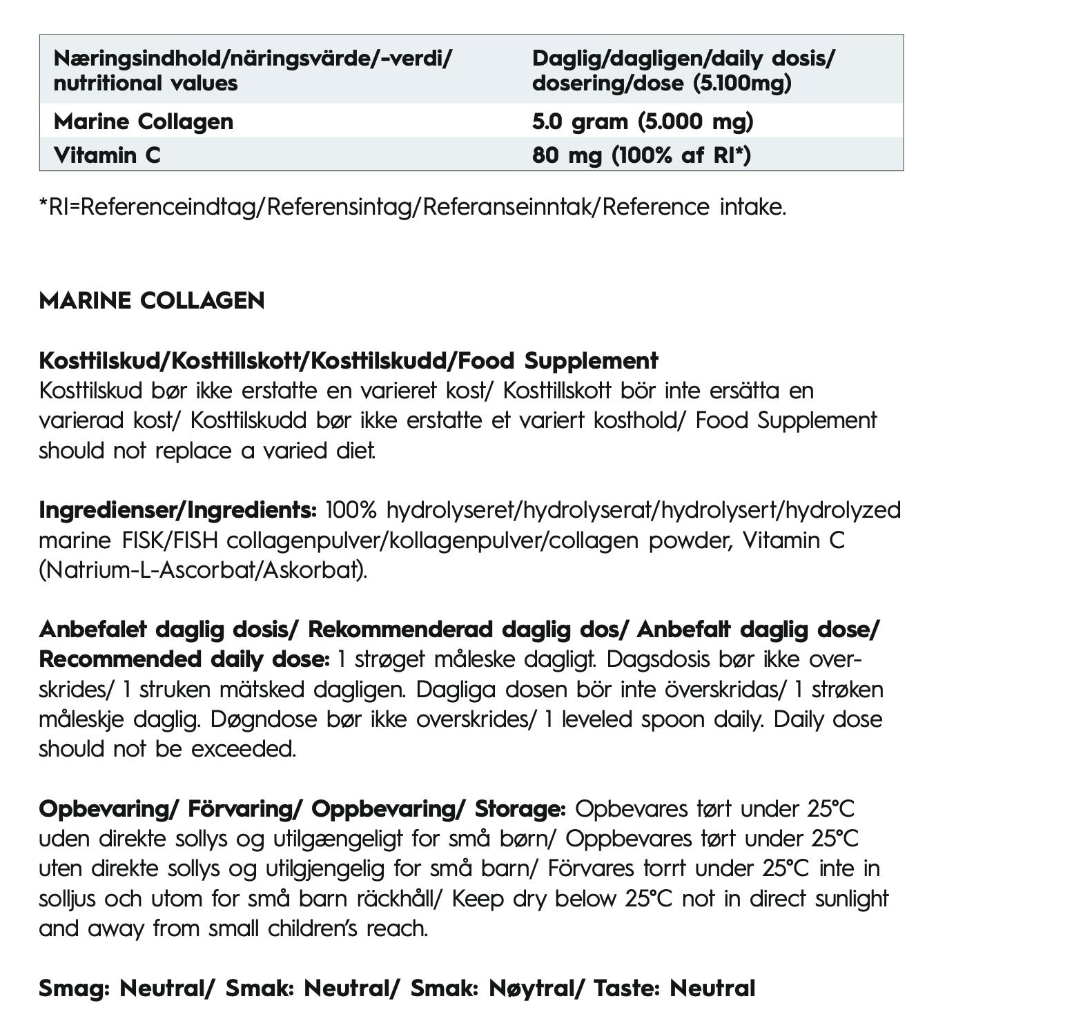 100% hydrolyseret/hydrolyserat/hydrolysert/hydrolyzed marine FISK/FISH collagenpulver/kollagenpulver/collagen powder Vitamin C (Natrium-L-Ascorbat/Askorbat).