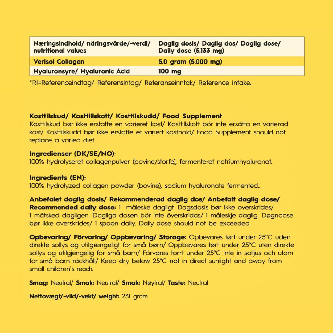 100% hydrolyseret kollagenpulver (bovine), fermenteret natriumhyaluronat.