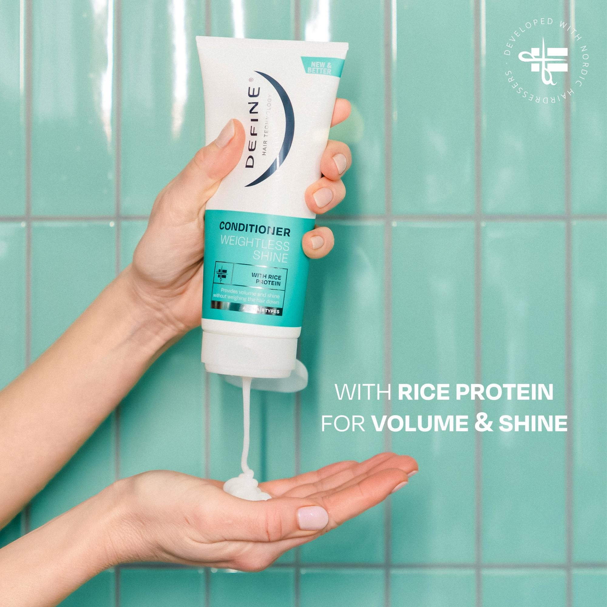 Weightless Shine Conditioner fra Define er et førsteklasses hårplejeprodukt, der er skabt til at give dit hår en strålende glans uden at tynge det ned.