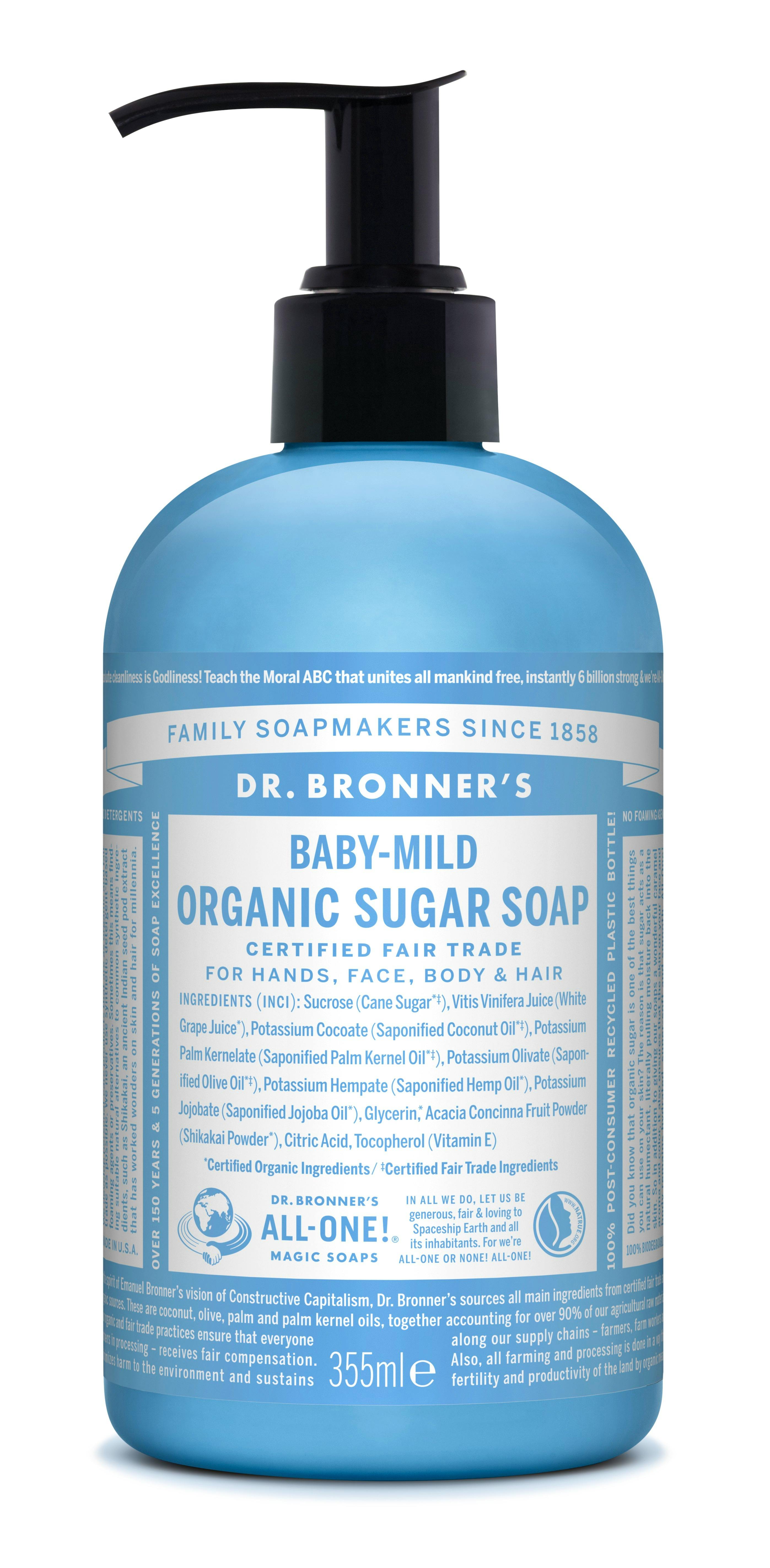 Dr. Bronner’s Organic Sugar Soap Baby Mild er en vegansk og økologisk sukkersæbe, der kommer i en praktisk pumpeflaske. Sæben kan anvendes både på hænder, ansigt, krop og hår. Denne sæbe er duftneutral og helt uden æteriske olier.
