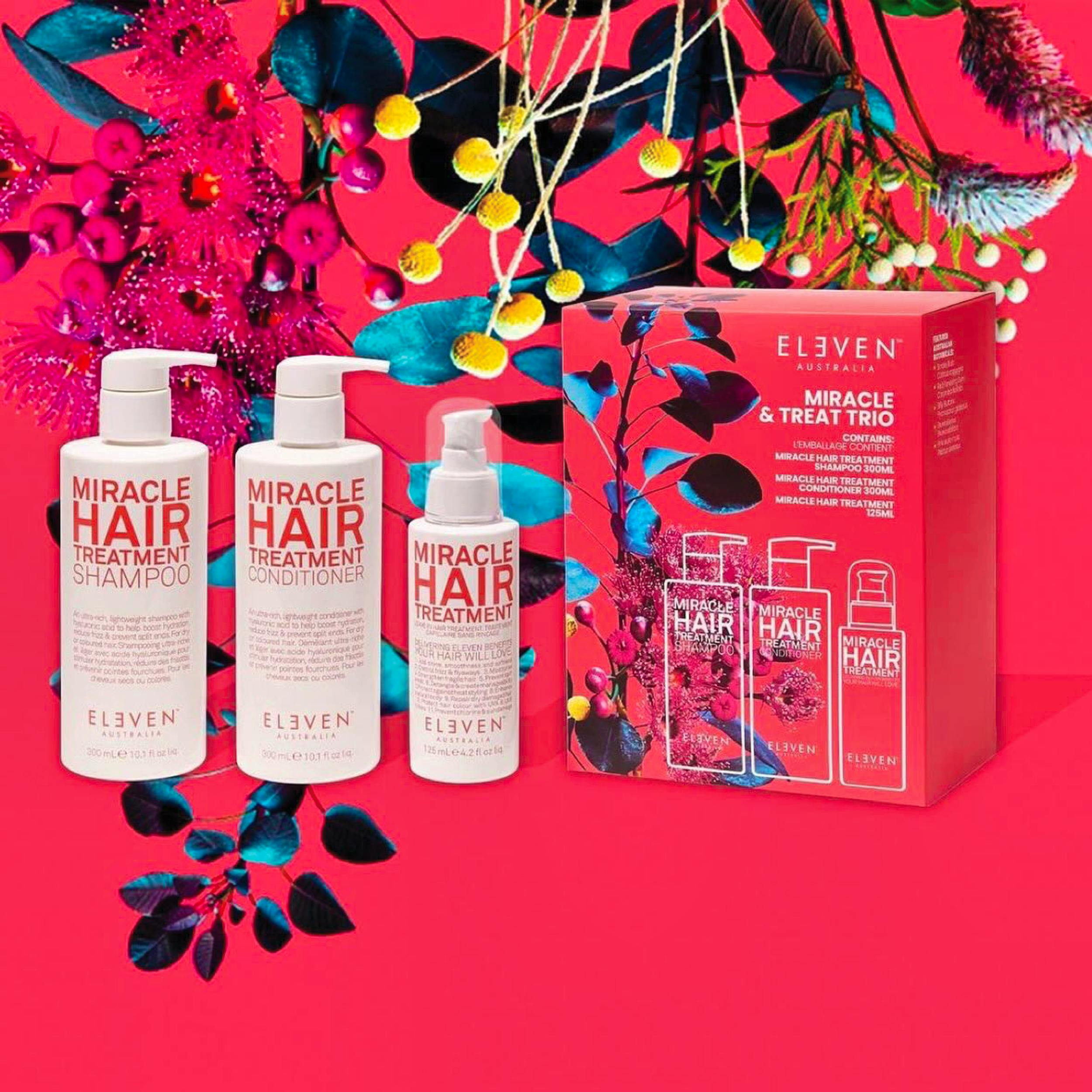 Gavesættet indeholder: Miracle Hair Treatment Shampoo 300ml + Miracle Hair Treatment Conditioner 300ml + Miracle Hair Treatment 125ml En ultra-rig, let ELEVEN Miracle Hair Treatment Shampoo med hyaluronsyre, der hjælper med at øge fugtigheden, reducere krus og forhindre spaltede spidser.