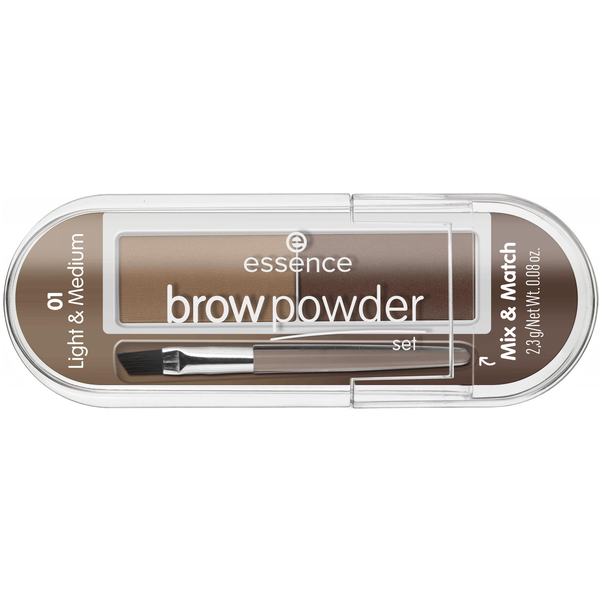 Wow-bryn er stadig garanteret med brynpuddersættet. Sættet indeholder to farvepuddere og en børste, som kan bruges til at give brynene form i et snuptag.