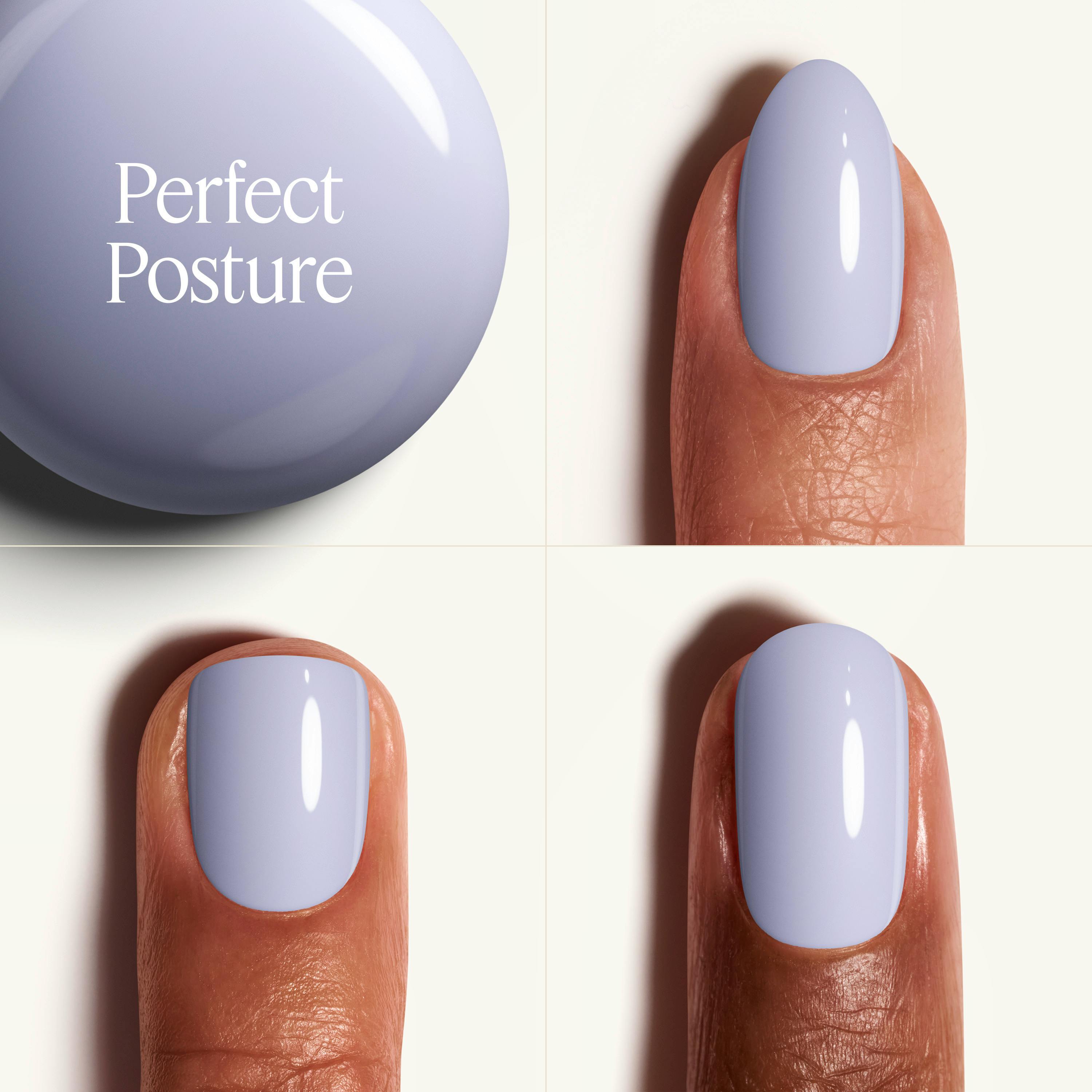 perfect posture er en lys blålilla neglelak med irisblå undertoner og ekstremt lang holdbarhed.