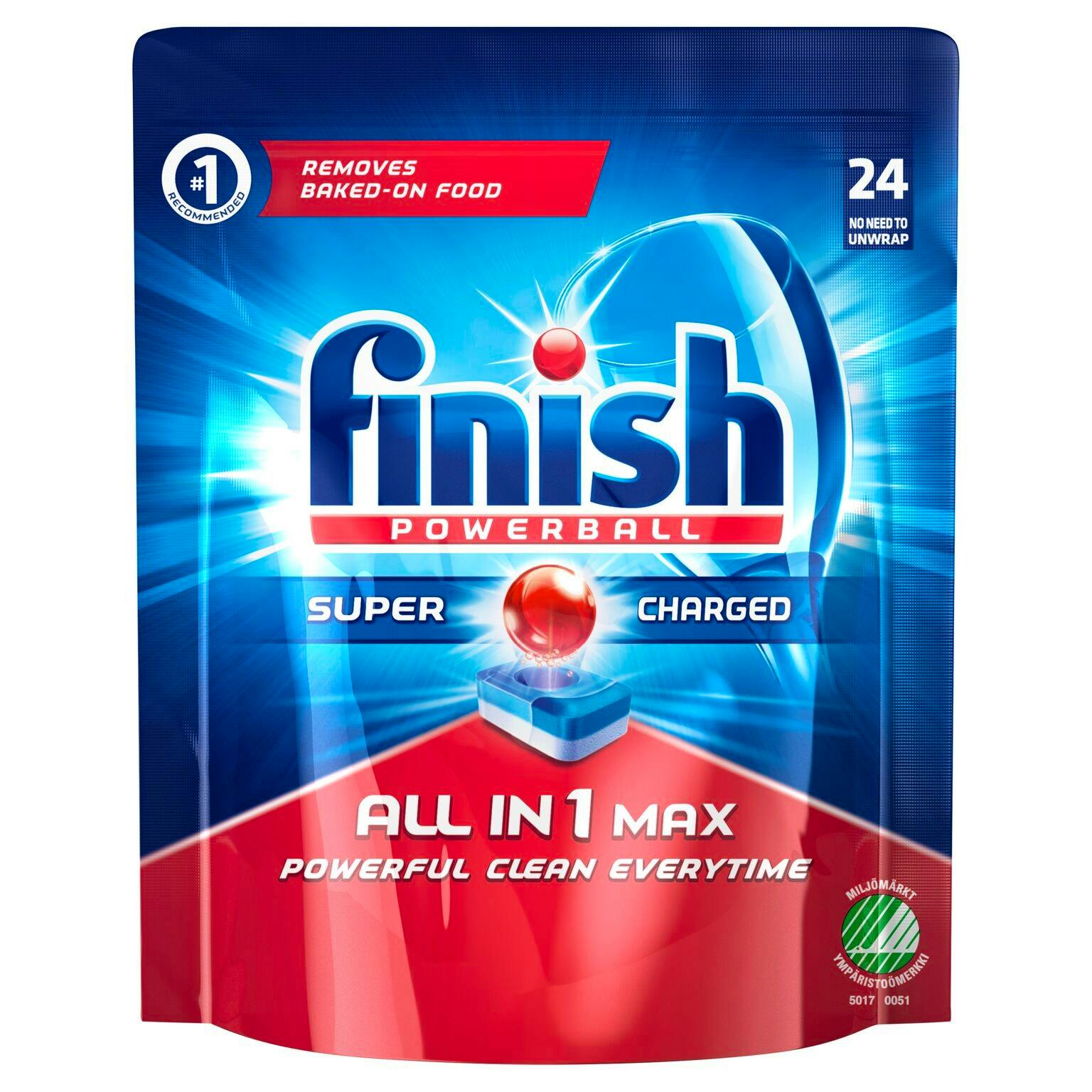 Powerball All-In-One Max fra Finish er effektive opvaskemaskinetabs, der hjælper din maskine med at rengøre servicen. Med disse opvasketabs kan du få både fedt, kalk og indgroede madrester af. Indeholder 24 stk.
