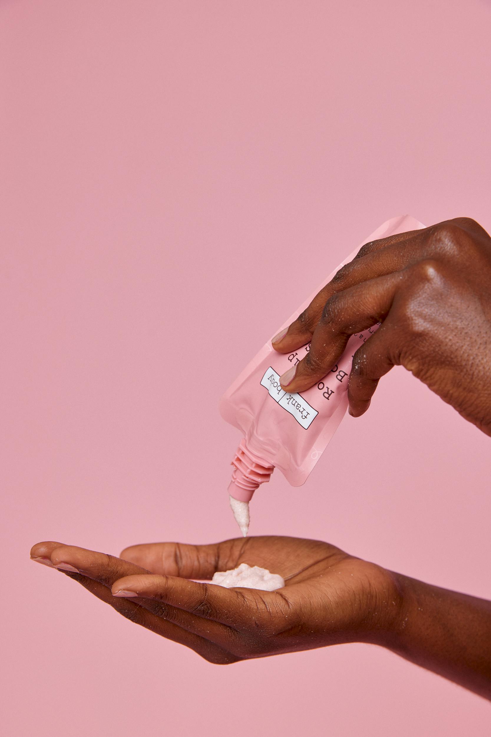 Et vegansk 2-i-1 skrub, som smelter til blød, rensende skum, som blidt bekæmper tør hud og plejer selv den mest sarte hud.