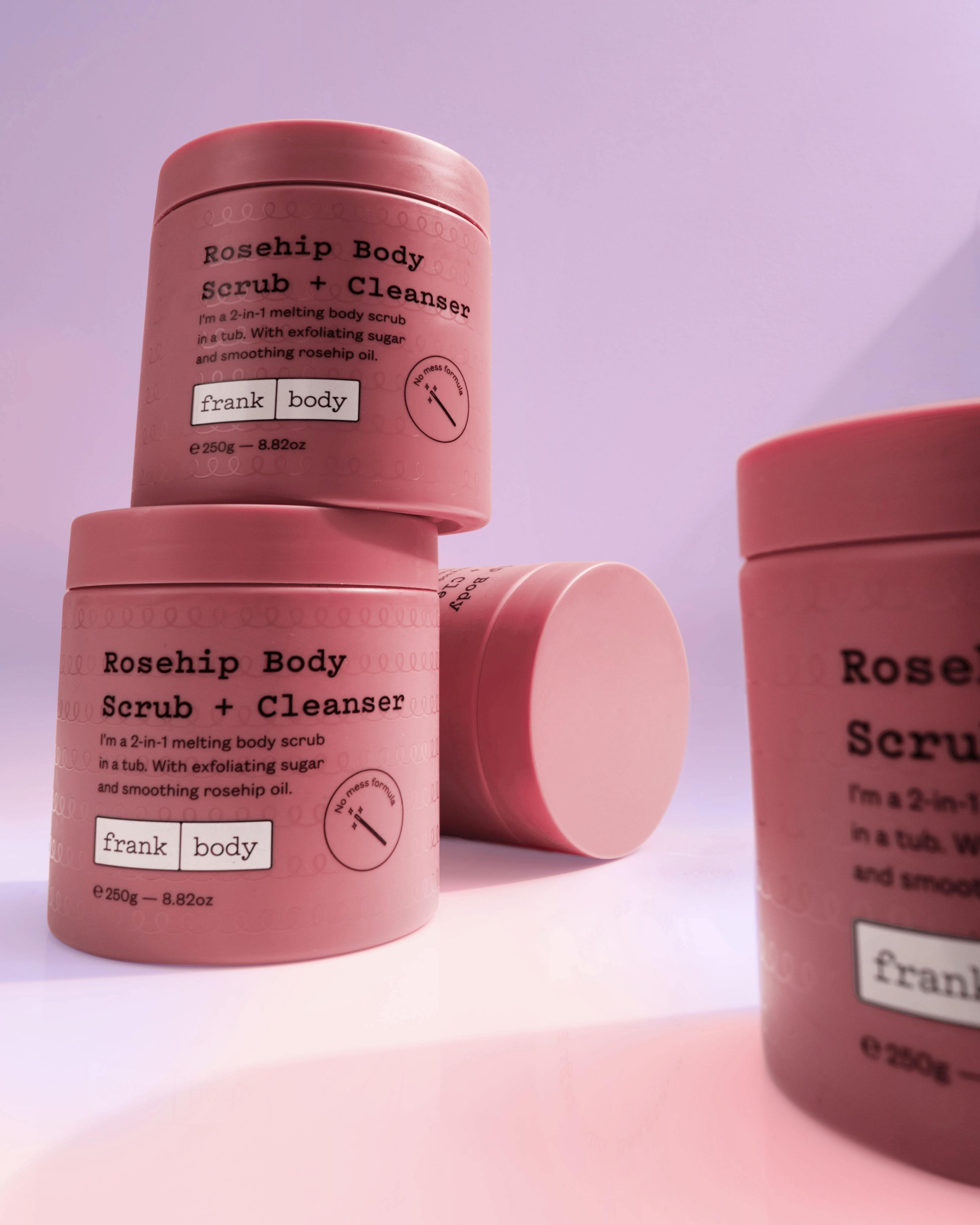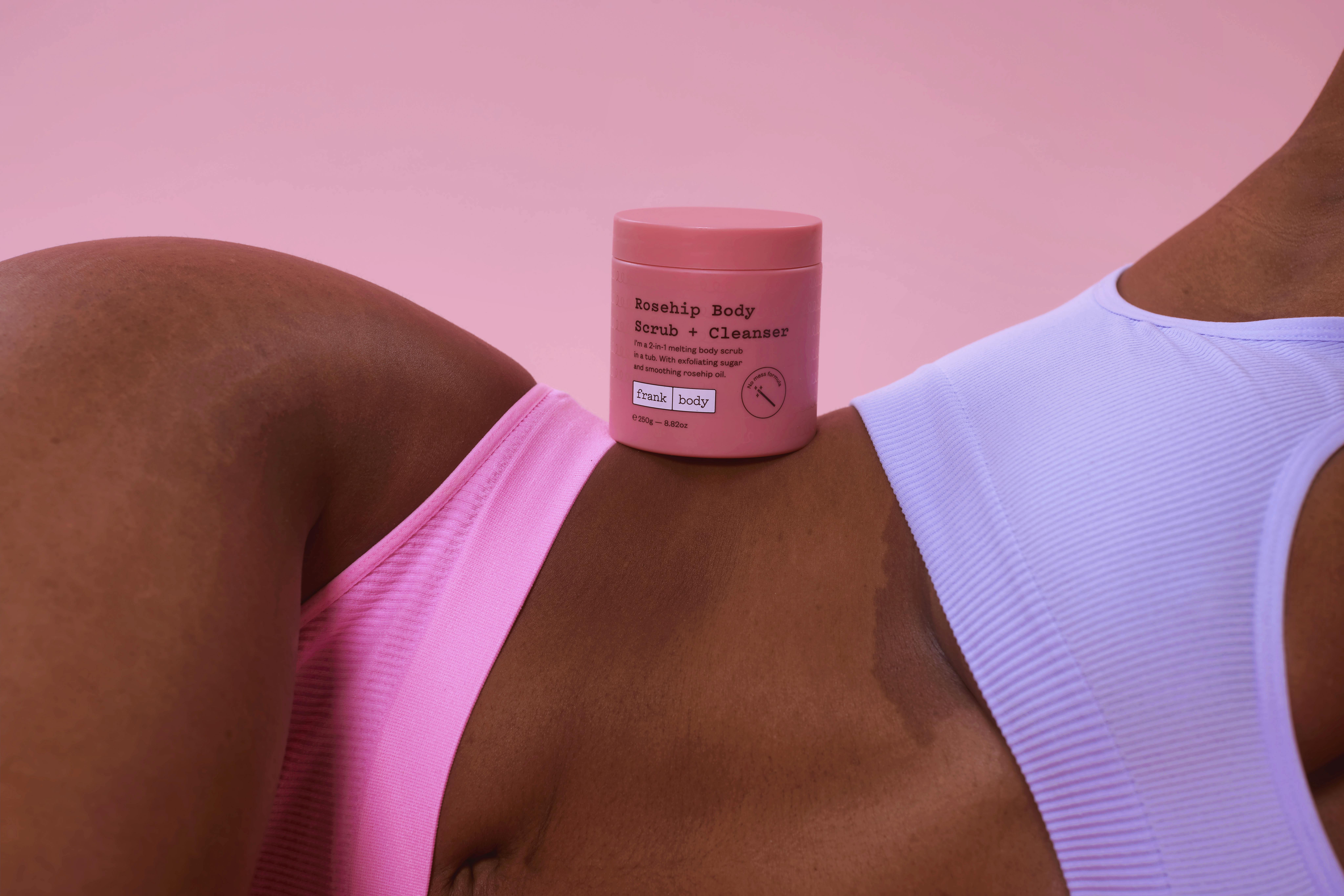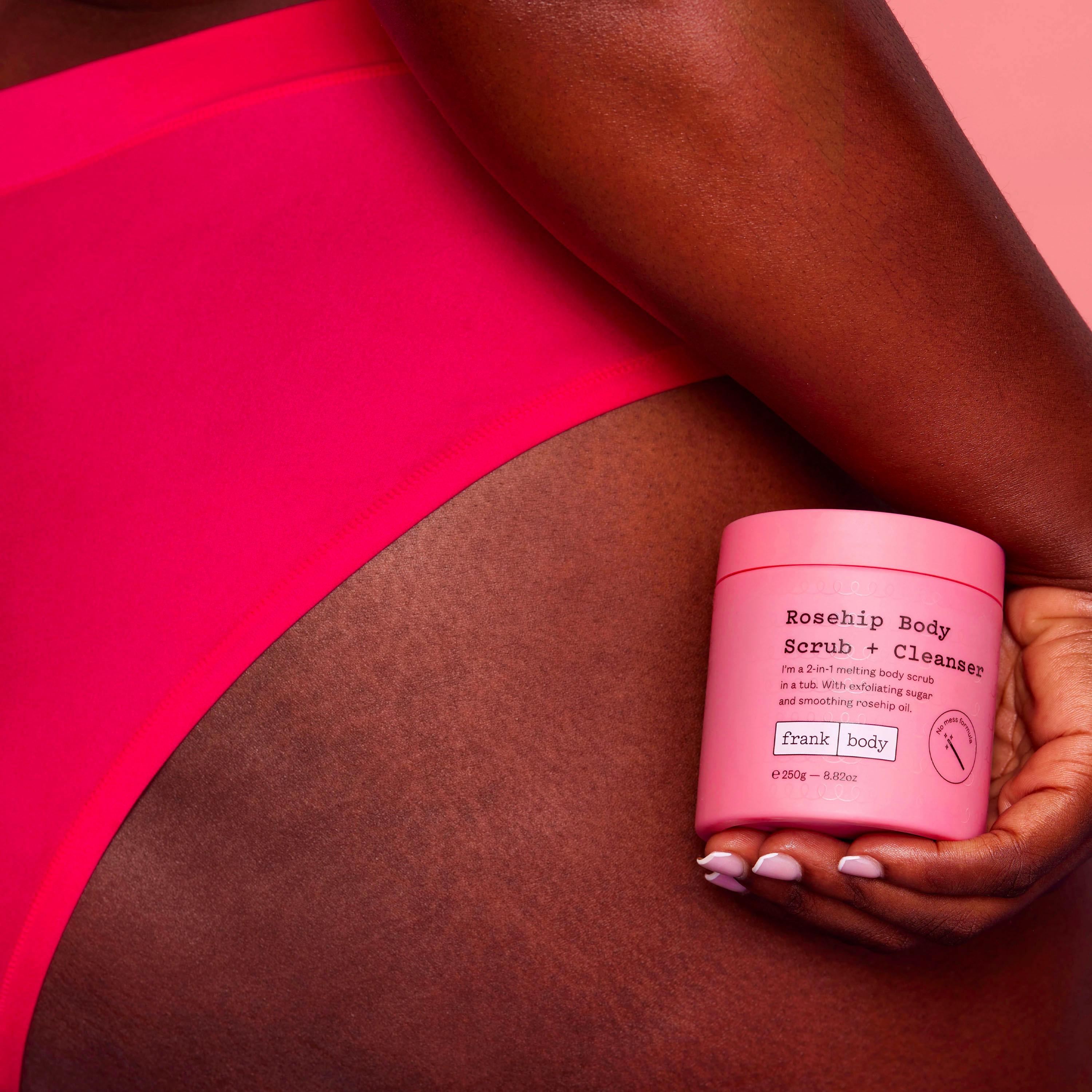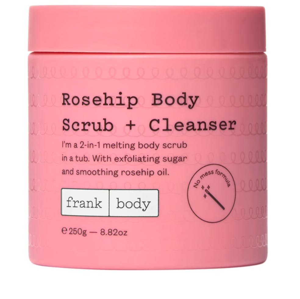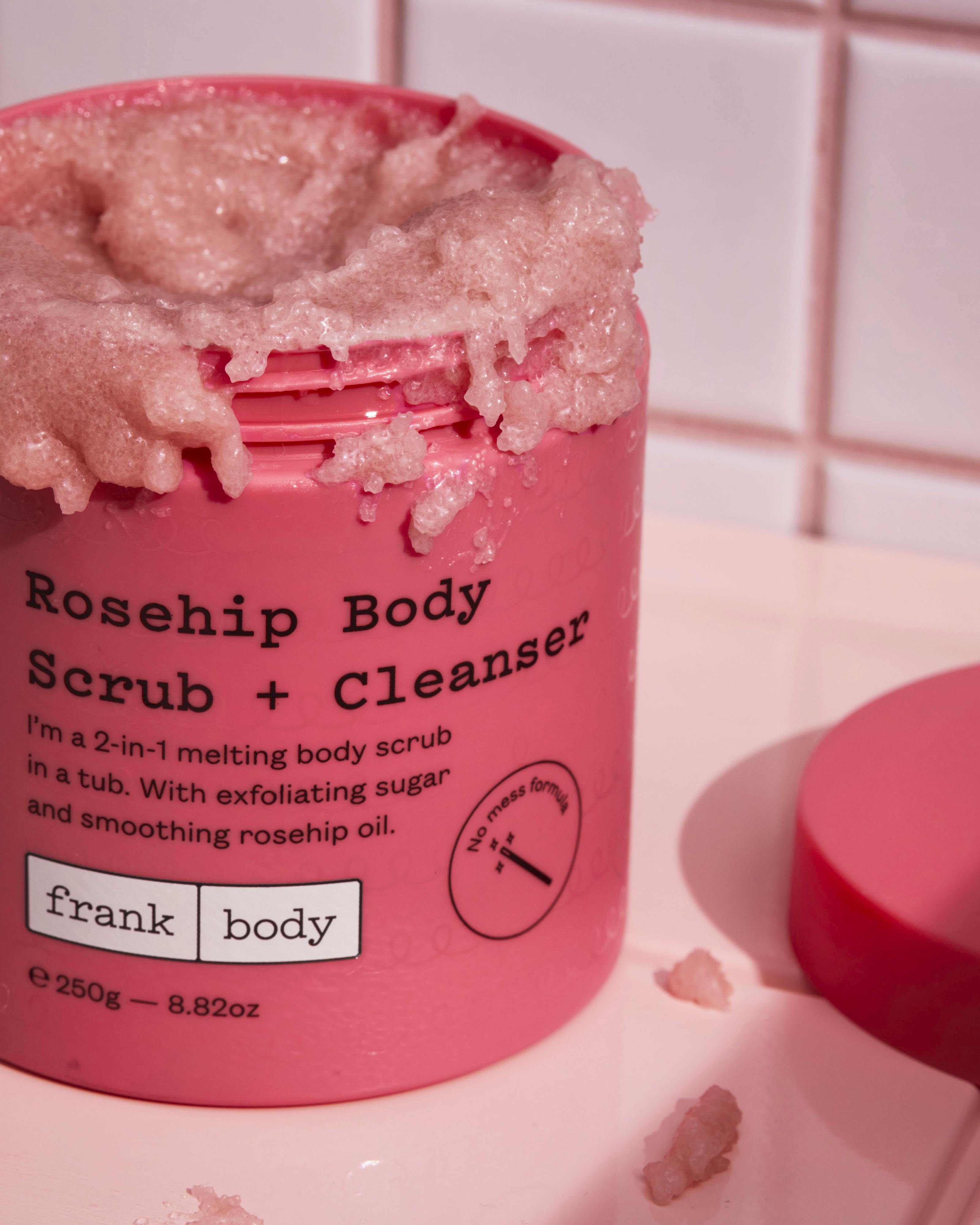 Frank Body's Rosehip Scrub + Cleanser er en alsidig bodyscrub, der er skabt til at forny og opfriske din hud.