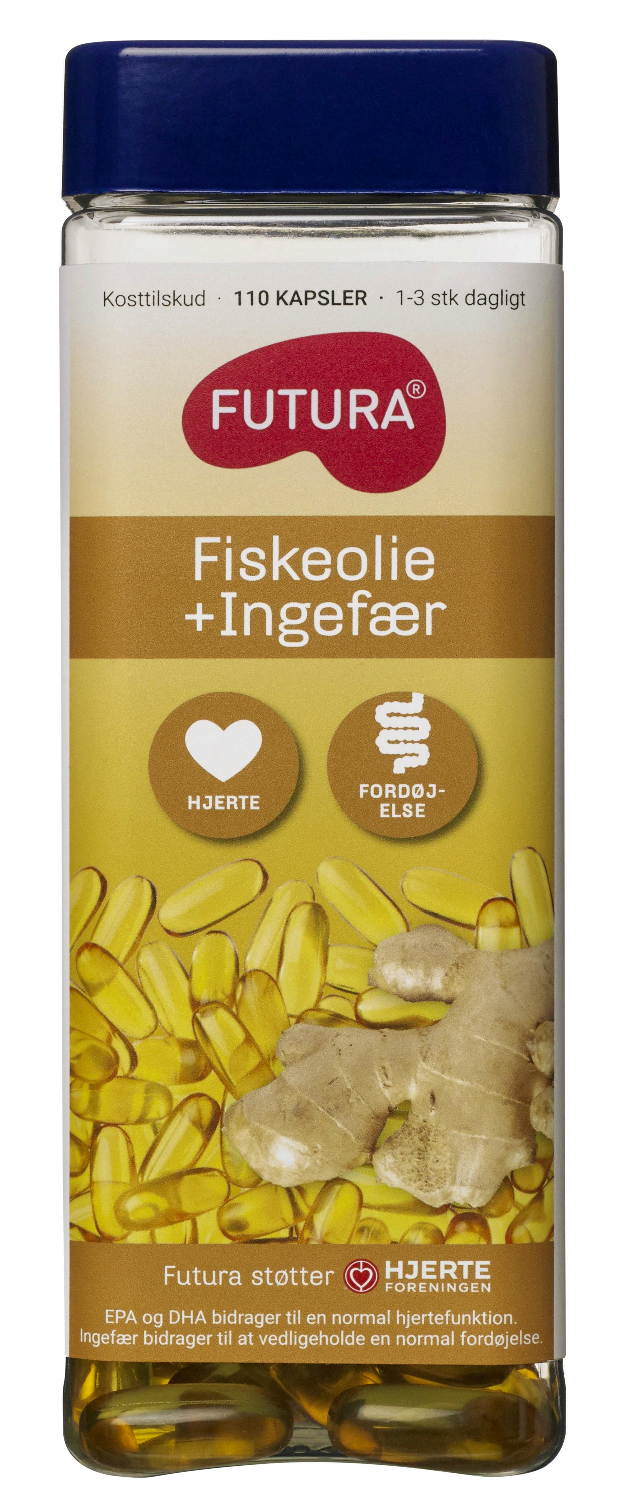 Futura Fiskeoliekapsler med Ingefær indeholder en kombination af både Omega-3 fedtsyrer og ingefærekstrakt, som har positive virkninger for hjertet. Kombinationen af ingefærekstrakt og Omega-3 fedtsyrer hjælper nemlig til at vedligeholde en normal hjernefunktion og et normalt syn, mens ingefær bidrager til at vedligeholde en normal fordøjelse. Denne bøtte indeholder 110 kapsler.
