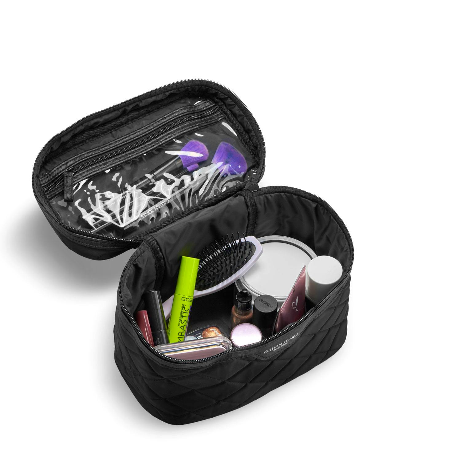 Beautyboks i 100% genanvendt plastik fra Gillian Jones. Urban Travel linjen er designet og produceret med mindst co2 aftryk som muligt. Beautyboksen kan foldes så den ingenting fylder. Designet er stramt, og indrettet med elastiske loops til at holde styr på dine dyrebare plejeprodukter. Der er god plads i boksen, der også har et stort transparent rum indvendig i toppen / låget af boksen. Materialet er vaskbar nylon med en fast kant i PU, der gør at beautyboksen holder faconen. Et stort lynlås vedhæng der giver selv de svageste fingre hjælp til åbningen. Stort udvalg af prints, så du selv kan blande det der passer dig bedst. Mix og match med make-up pung og kosmetiktaske. Vi udstopper taskerne i Danmark for at spare på co2 under fragten, der er stor synder i vores fælles co2 regnskab.