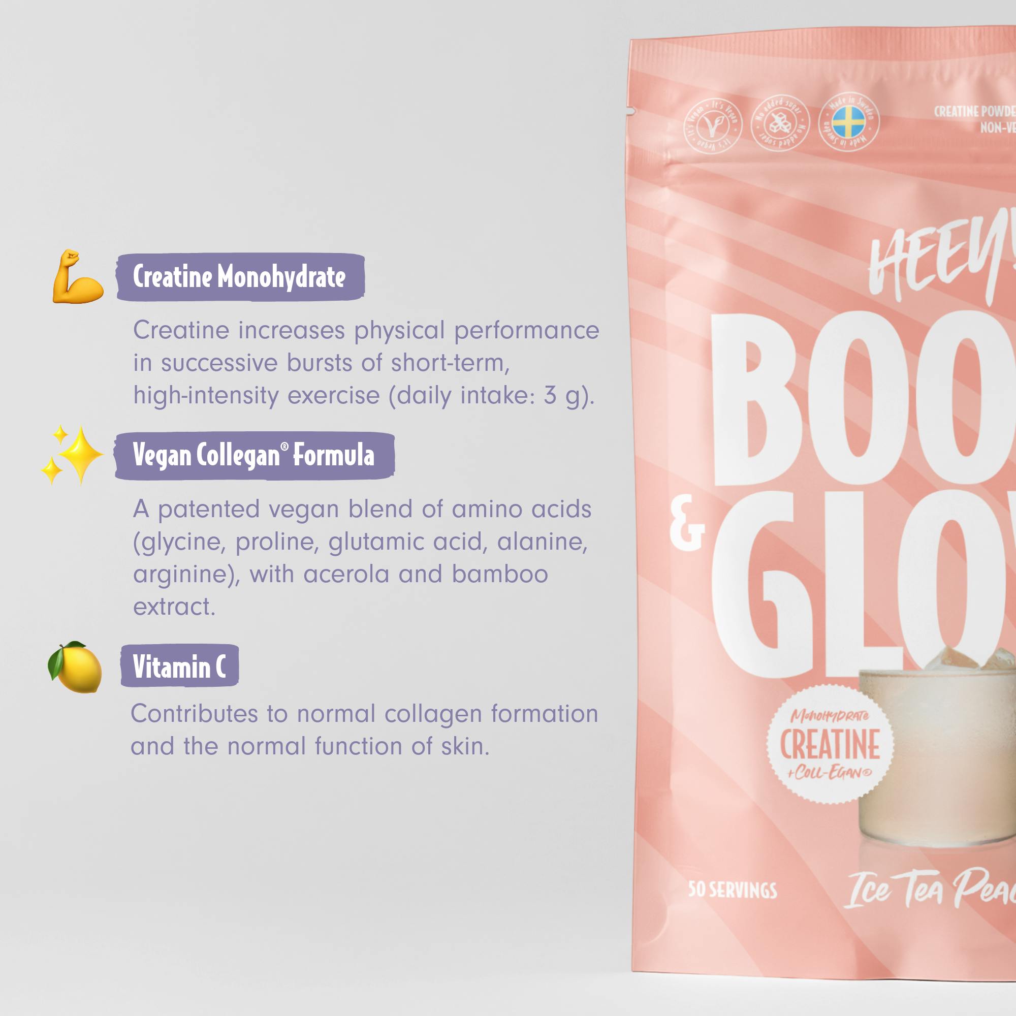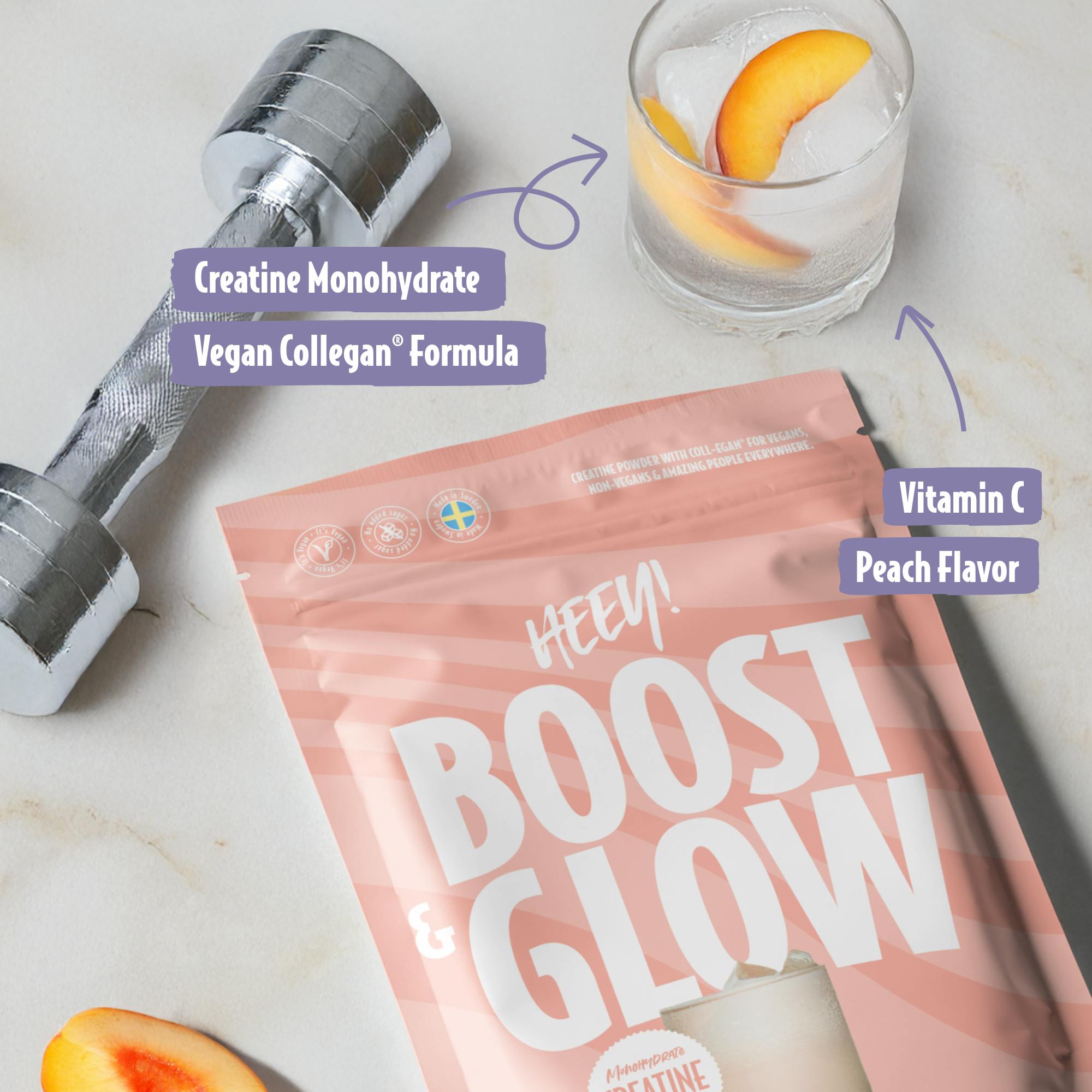 Styrk din krop og få en naturlig udstråling med Heey! Boost & Glow – en innovativ formel, der kombinerer ultrafint kreatin med Coll-egan®, en patenteret vegansk kollagenbooster. Perfekt til dig, der ønsker at støtte både din fysiske styrke og hudens sundhed.