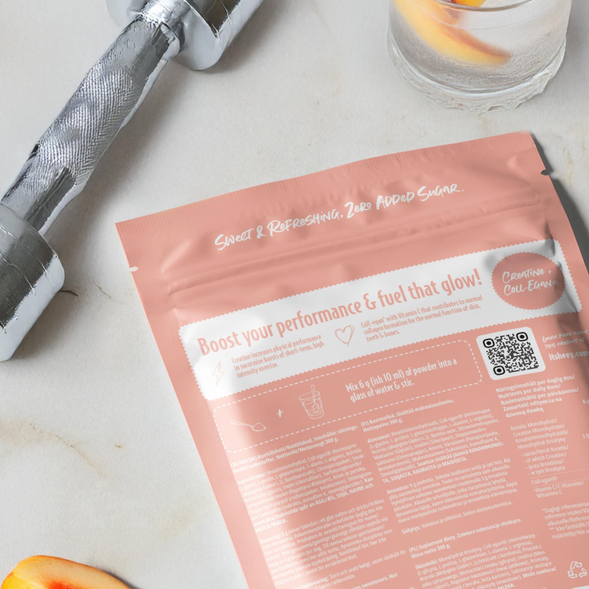 Creatine monohydrate, Coll-egan® (Amino acids (L-glycine, L-Prolin, L-Glutamic acid, L-alanine, L-arginine), Vitamin C (Acerola (Malpighia Glabra L.)), Bamboo extract), Lemon juice powder, Flavor enhancer (Glycine), Inuline (Chickory root fiber), Acidity regulator (Malic acid), Peach Aroma, Color (Beetroot powder, Beta carotene), Sweeteners (Sucralose, Acesulfam k, Steviolglycosides). May contain traces of EGG, SOY, OAT, and MILK.