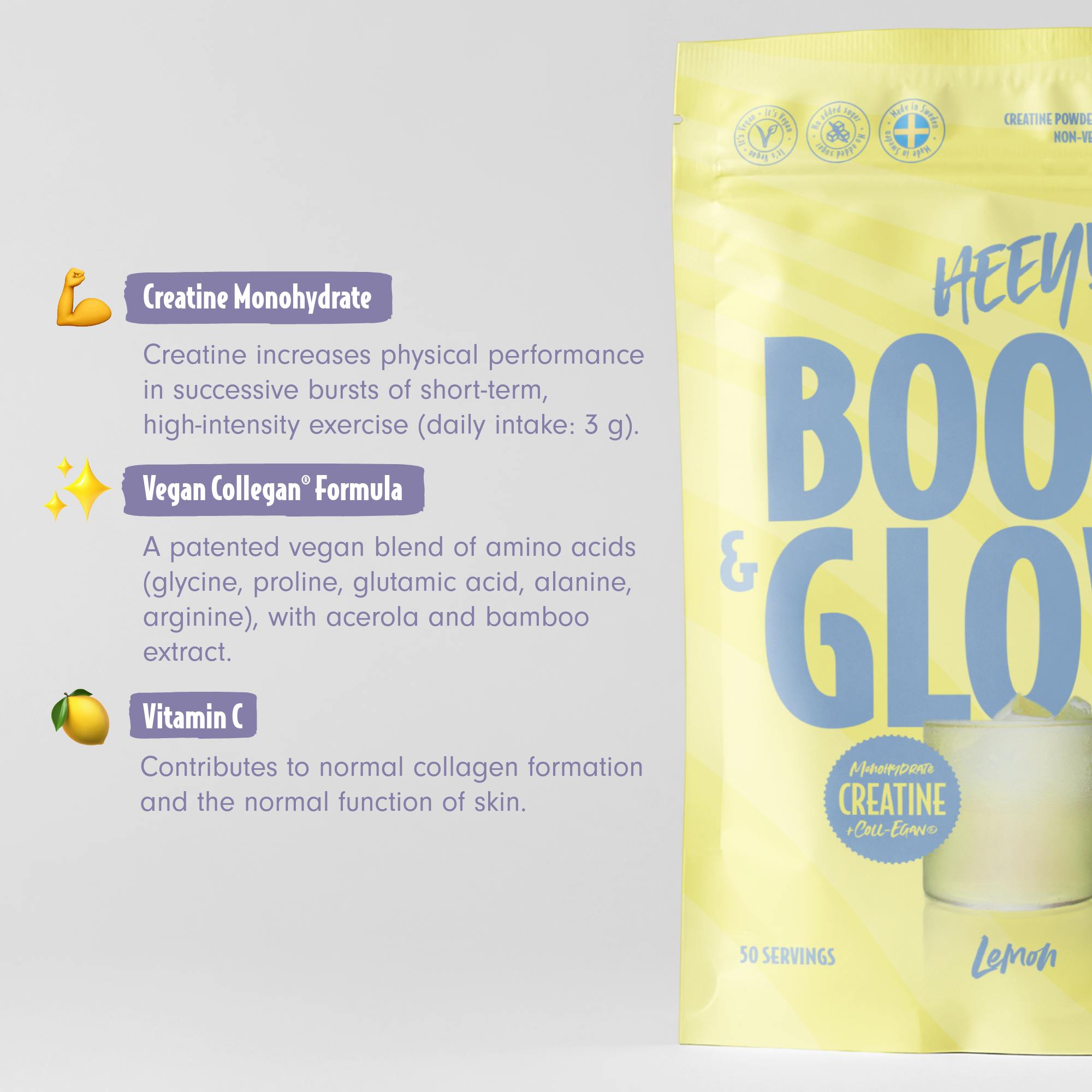 Styrk din krop og få en naturlig udstråling med Heey! Boost & Glow – en innovativ formel, der kombinerer ultrafint kreatin med Coll-egan®, en patenteret vegansk kollagenbooster. Perfekt til dig, der ønsker at støtte både din fysiske styrke og hudens sundhed.