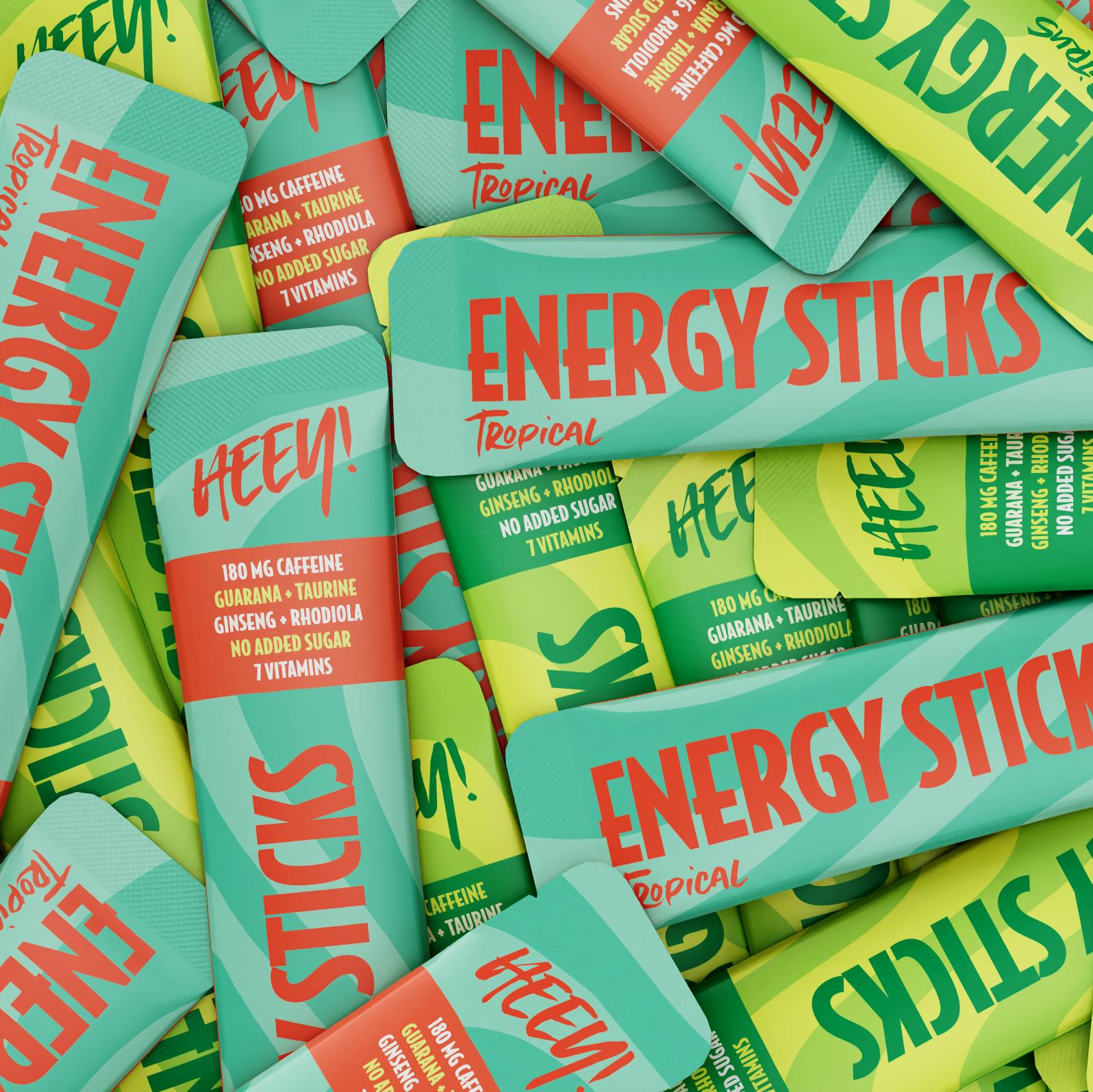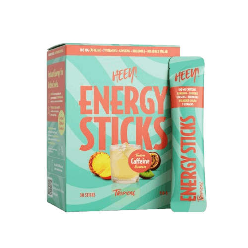 Heey! Energy Sticks indeholder 180 mg koffein fra blandt andet guarana, samt taurin og naturlige ekstrakter som ginseng og rosenrod – alt i en lille stick, der nemt blandes med koldt vand i din drikkeflaske eller et glas.