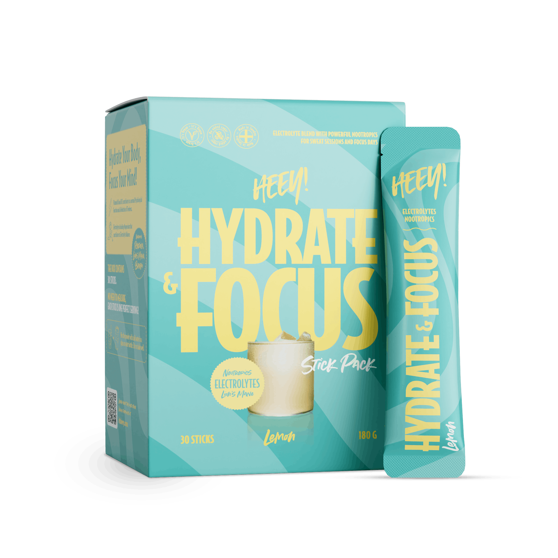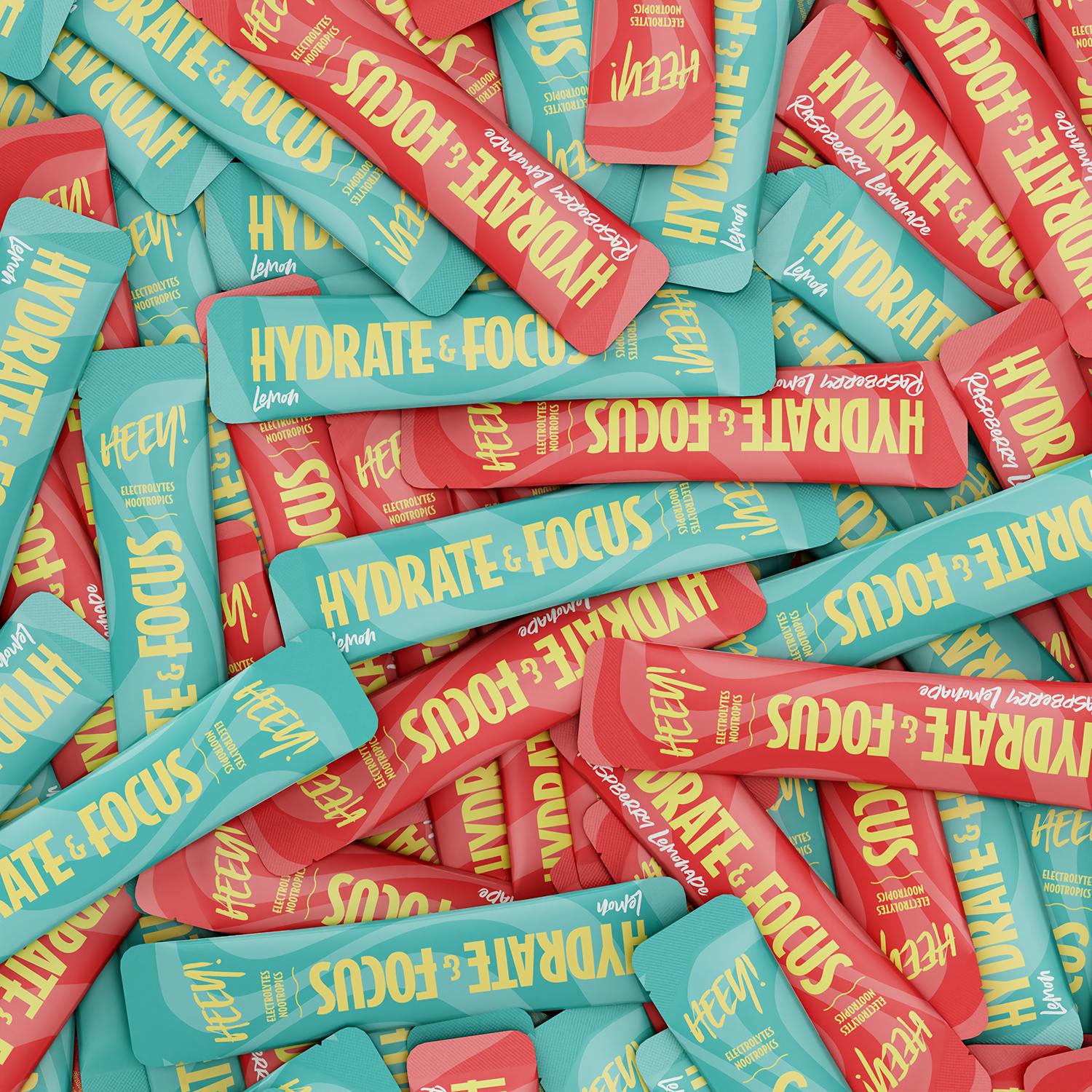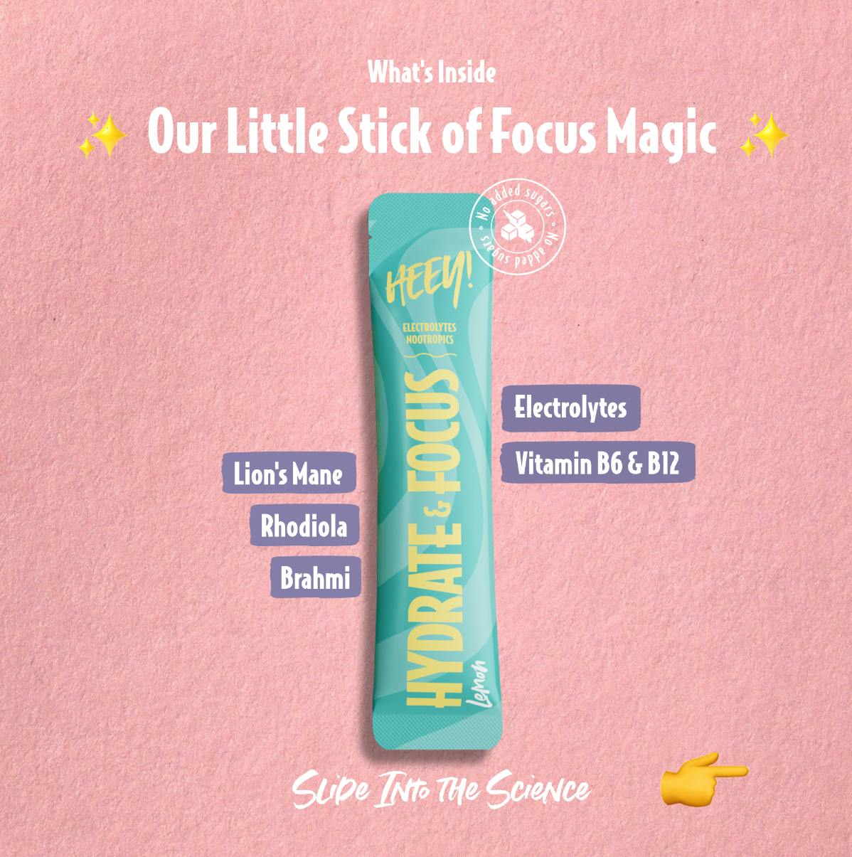 Heey! Hydrate & Focus fås både som genlukkelig pose til daglig brug og som praktiske stick packs, klar til farten.