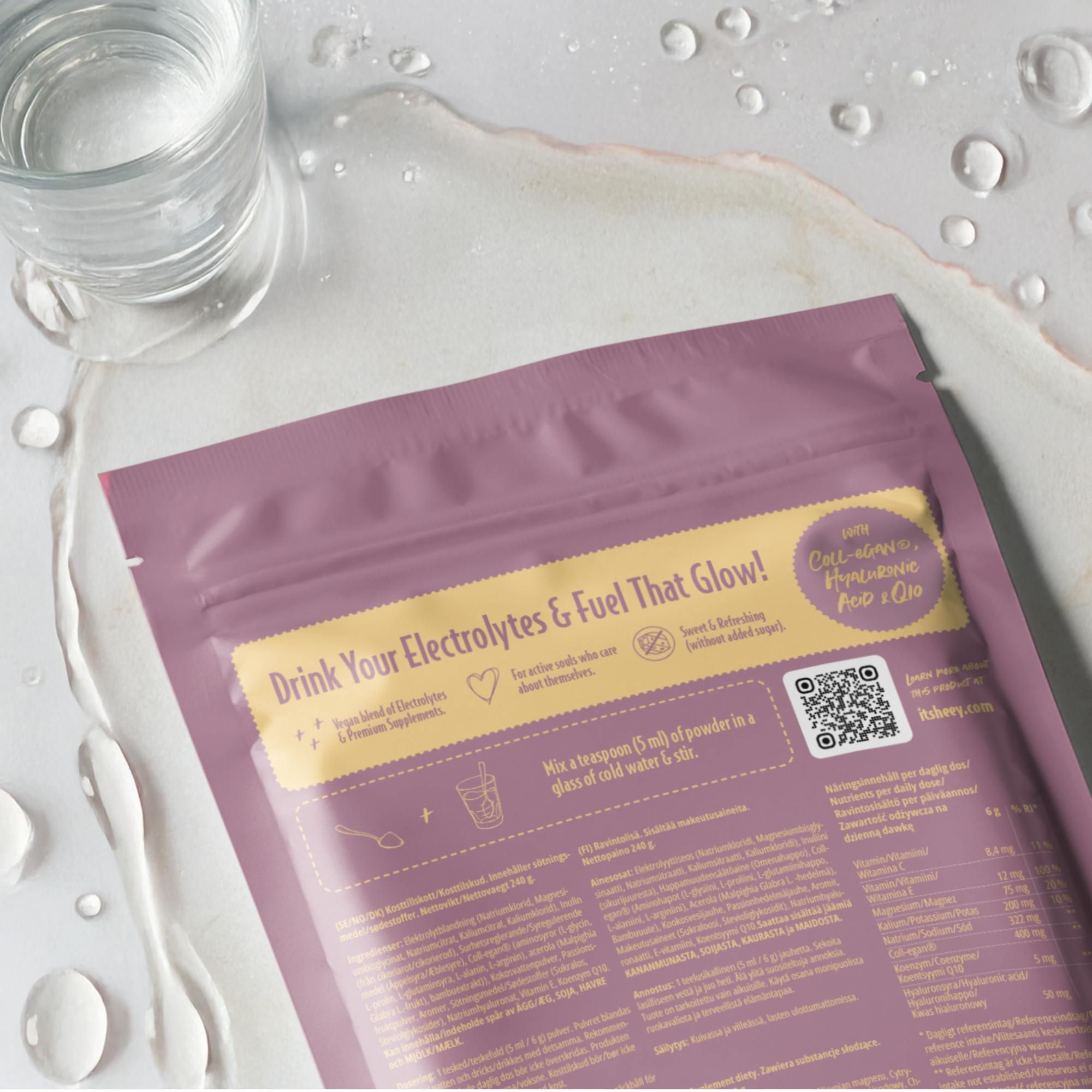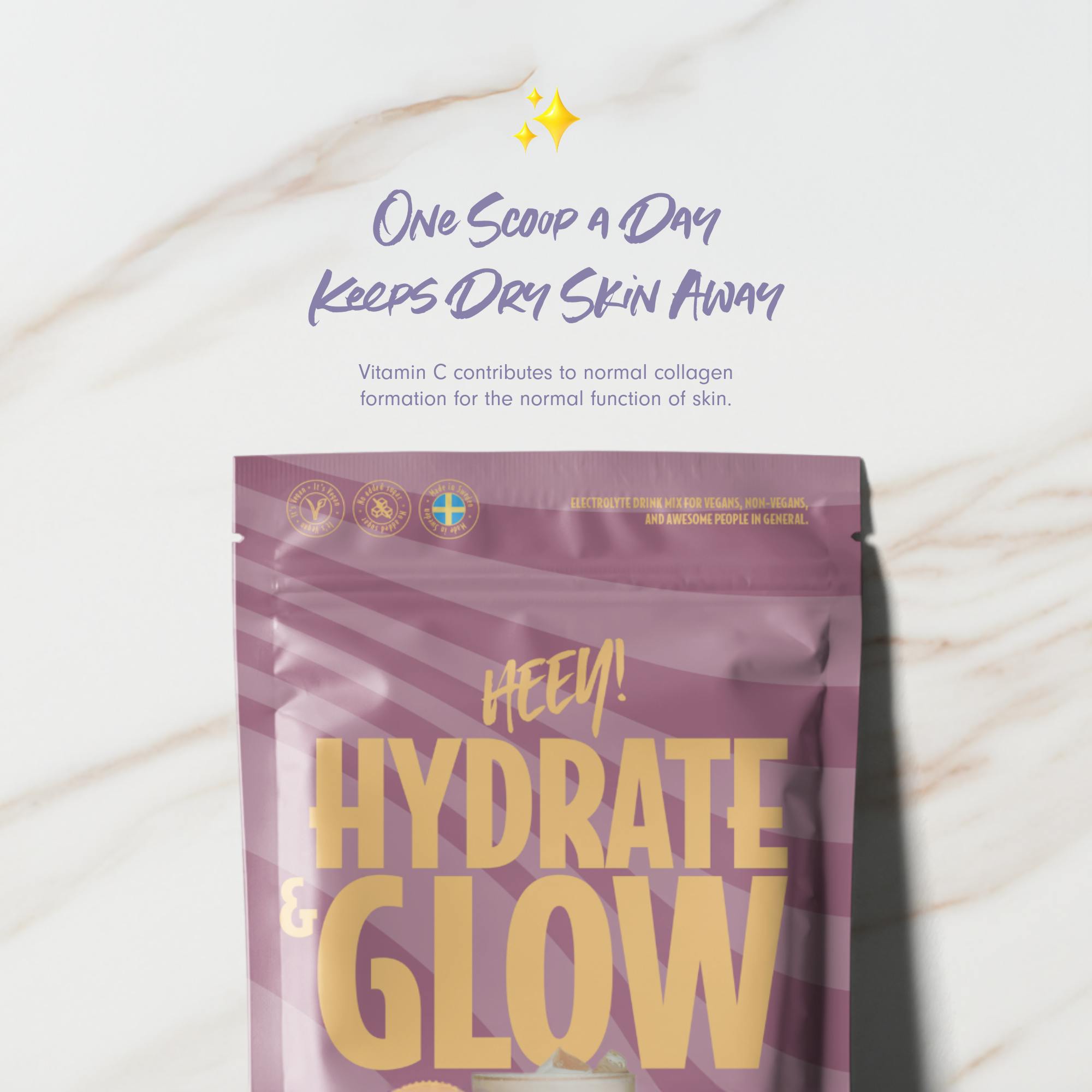 Med naturligt frugtpulver er Heey! Hydrate & Glow let at blande med vand og nyde når som helst. Selvfølgelig 100% vegansk og uden tilsat sukker.