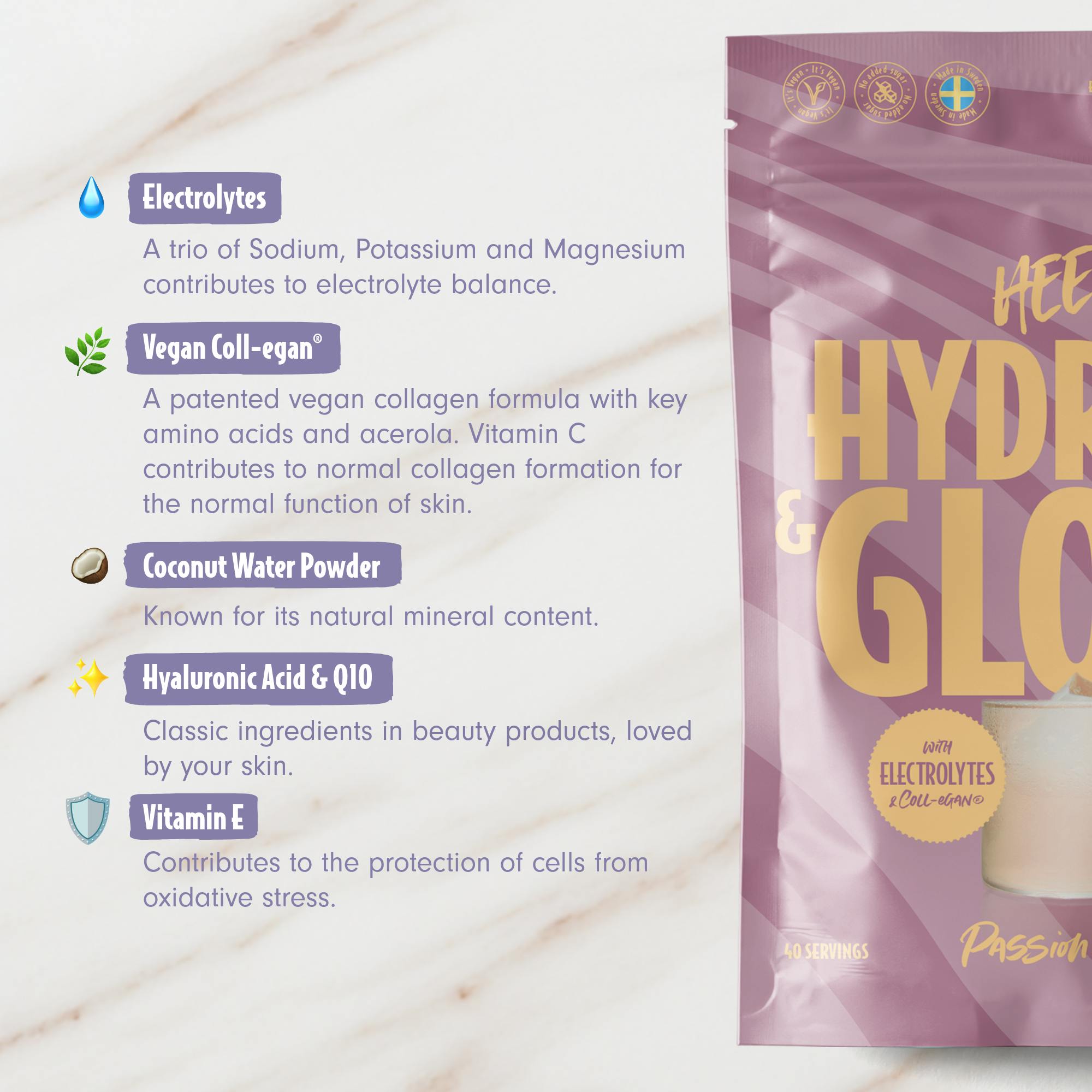 • Coll-egan®: Patenteret plantebaseret ingrediens med Vitamin C, der bidrager til normal kollagenproduktion – et effektivt vegansk alternativ til traditionelt kollagen!