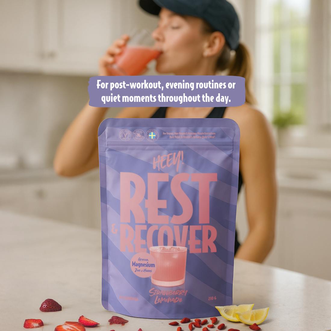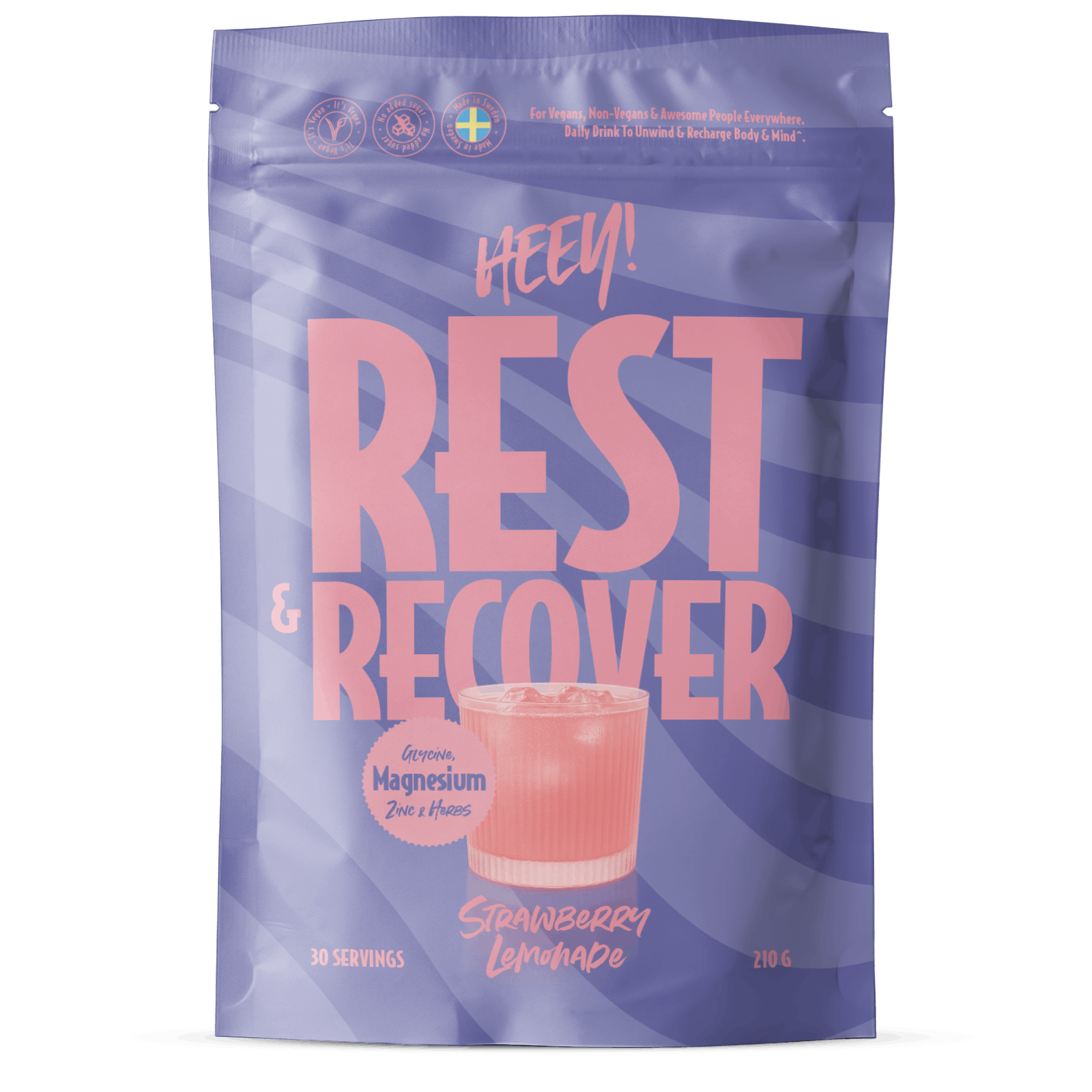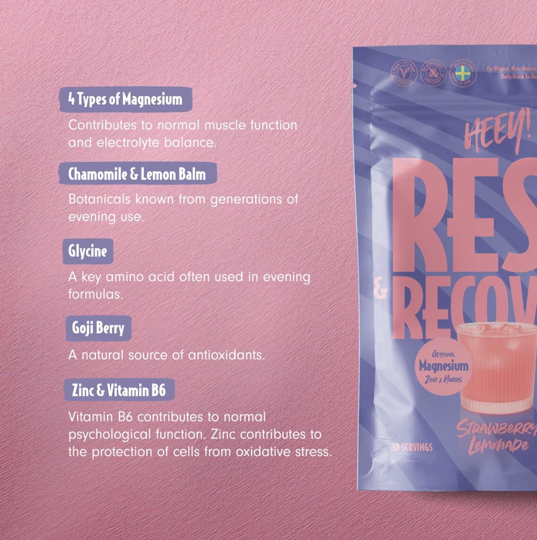 Heey! Rest & Recover er et kosttilskud udviklet til at støtte kroppen, når det er tid til at geare ned. Formlen kombinerer fire letoptagelige former for magnesium – citrat, taurat, bisglycinat og malat – med vitamin B6, zink, glycin og ekstrakter fra kamille, citronmelisse og gojibær.