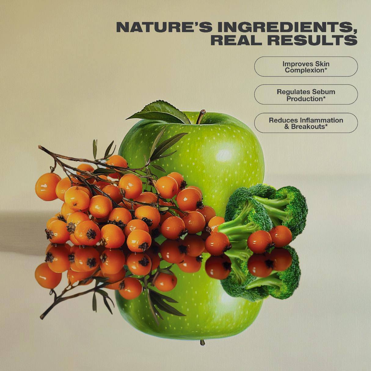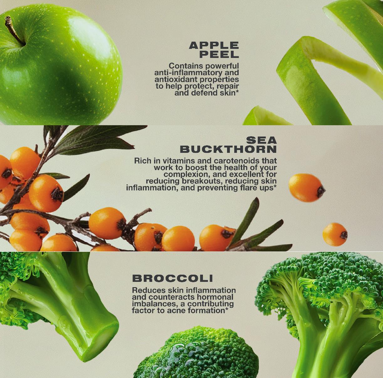 Sea Buckthorn, Apple Peel, Broccoli, non-GMO soluble corn fiber, purified water, agar, sodium citrate, citric acid, lecithin, natural fruit flavor , stevia leaf extract, coconut oil, carnauba wax,