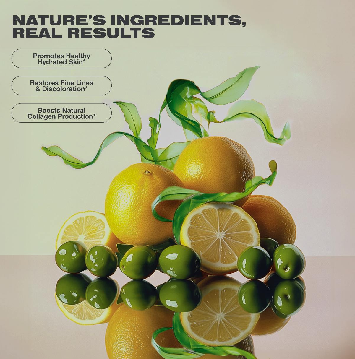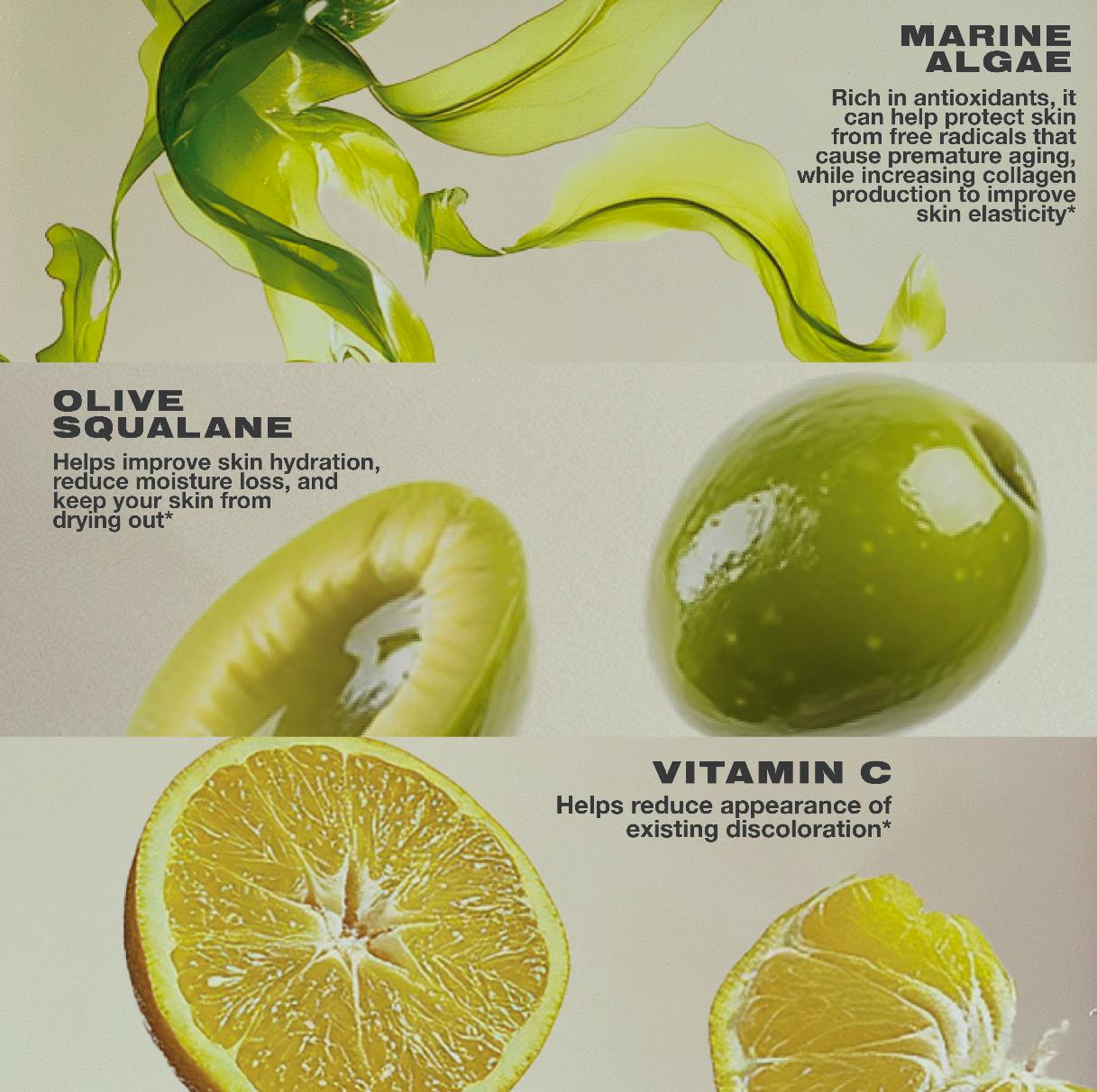 Marine Algae, Olive Squalane, Vitamin C, non-GMO soluble corn fiber, purified water, agar, sodium citrate, citric acid, lecithin, Black carrot juice, stevia leaf extract, coconut oil, carnauba wax,