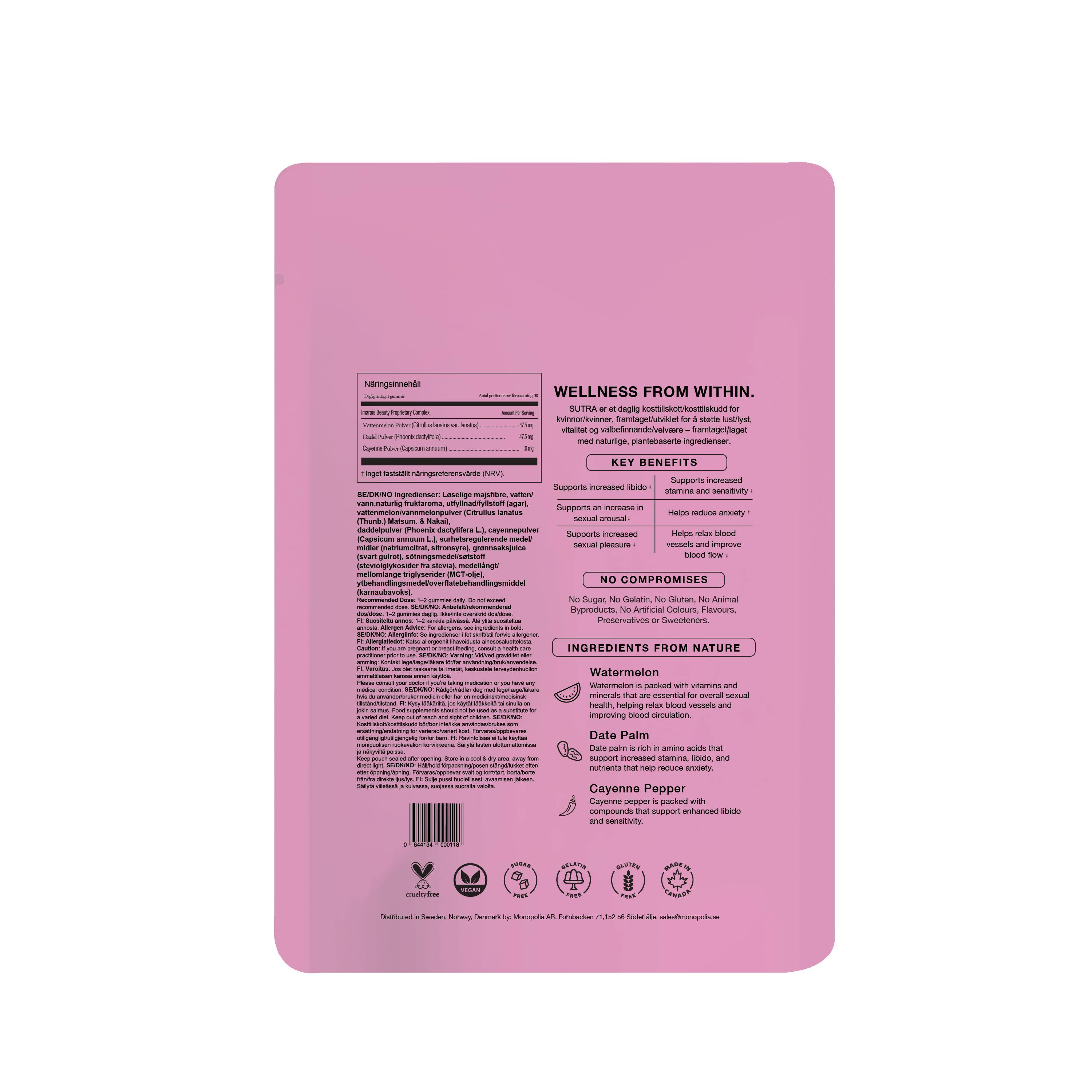 Sutra Womens Sexual Wellness Watermelon fra Imaraïs Beauty er et nøje udviklet vitamintilskud, der er skabt til at støtte kvinders seksuelle sundhed og generelle velvære.
