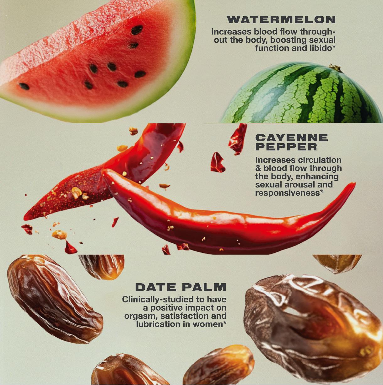Watermelon, Date Palm, Cayenne Pepper, non-GMO soluble corn fiber, purified water, agar, sodium citrate, citric acid, lecithin, natural fruit flavor , stevia leaf extract, coconut oil, carnauba wax,