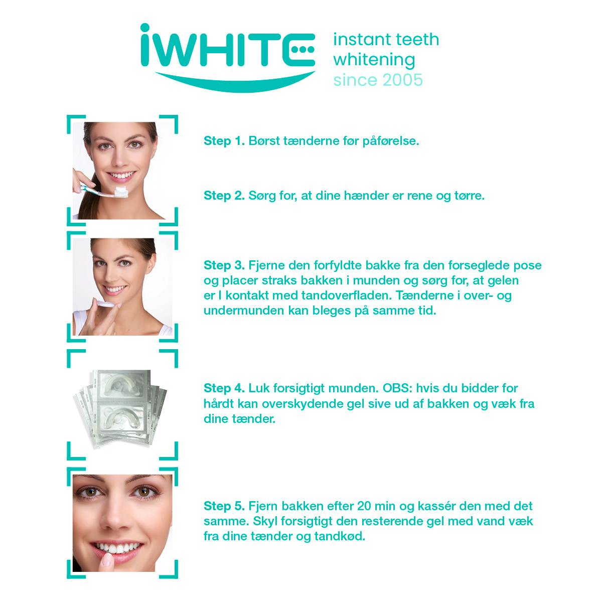 ★ KLINISK BEVISTE INGREDIENSER OG RESULTATER - iWHITE Tandblegningssæt er et let at bruge, tandsikkert og øjeblikkeligt tandblegningssæt til professionelle blegningsresultater derhjemme. Produktet indeholder en revolutionerende blegegel, som er klinisk bevist sikker og øjeblikkelig effektiv.