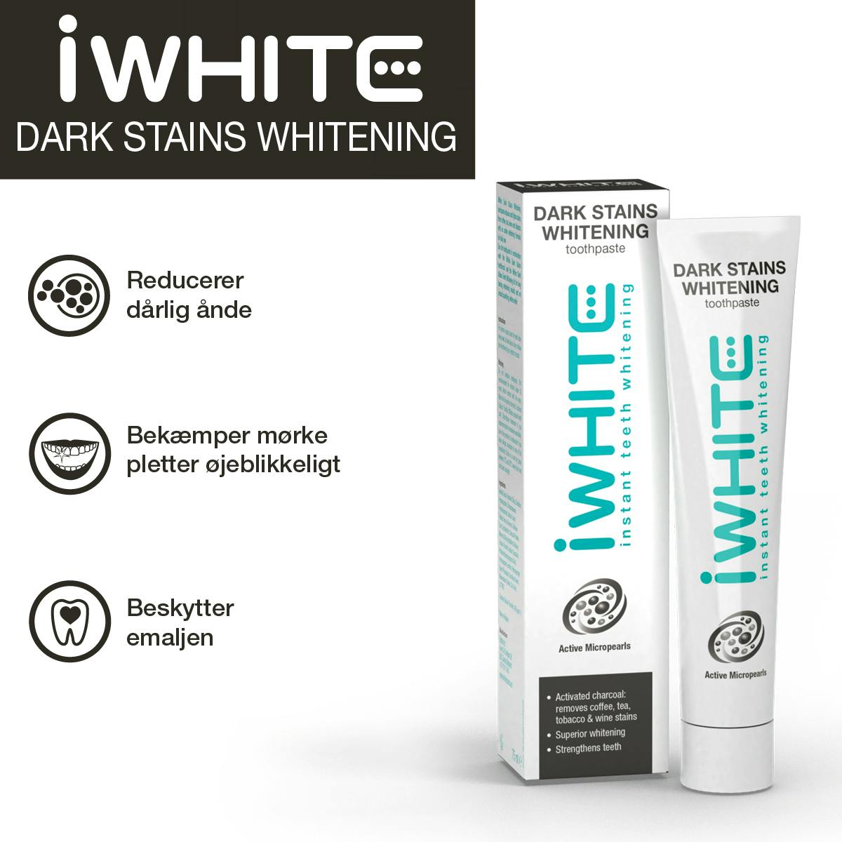 ★ IWHITE DARK STAINS TOOTHPASTE - tandblegende tandpasta som indeholder en aktiv blegningsformel med aktivt kul. Denne unikke formel er specielt udviklet til at angribe og bekæmpe mørke pletter fra kaffe, te, vin og tobak.