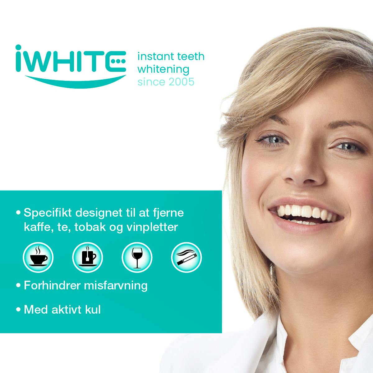 ★ IWHITE MICROPEARL TEKNOLOGI - iWHITE tandpastaen er tilsat mikroperler, som er fyldt med aktivt kul. Ved brug vil mikroperlerne briste, og de koncentrerede aktive stoffer i mikroperlerne vil blive frigivet. Resultat? Et lyst, hvidt smil!