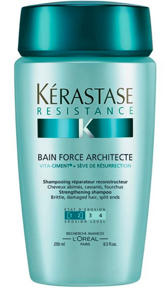 Kerastase Resistance Bain Force Architecte Strengthening Shampoo 250 ml er en plejende shampoo til skadet hår der knækker og får spaltede spidser. Den indeholder pro-keratin der rekonstruerer hårets styrke og efterlader det lækkert fugtet, styrket og med en helt ny sundhed og glans.