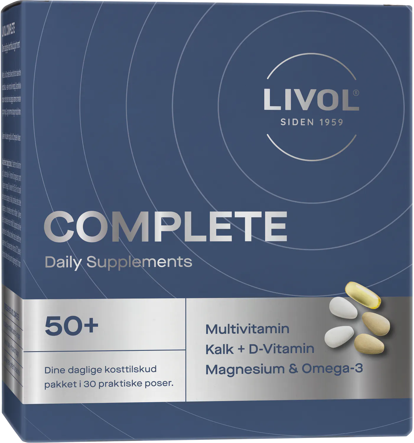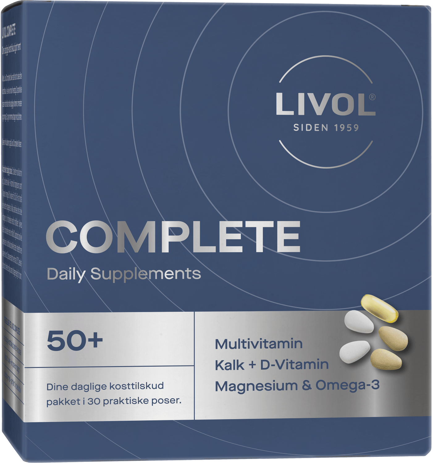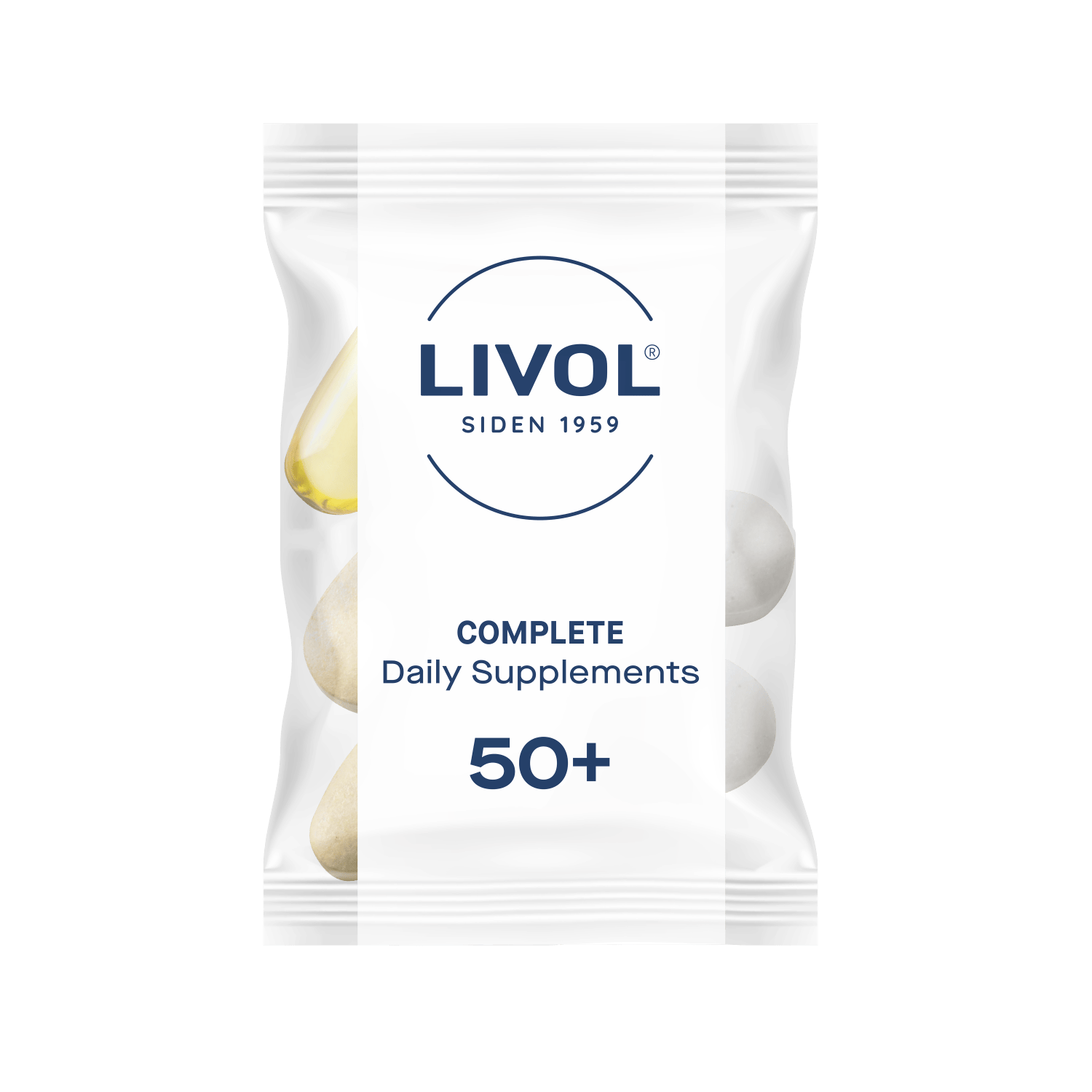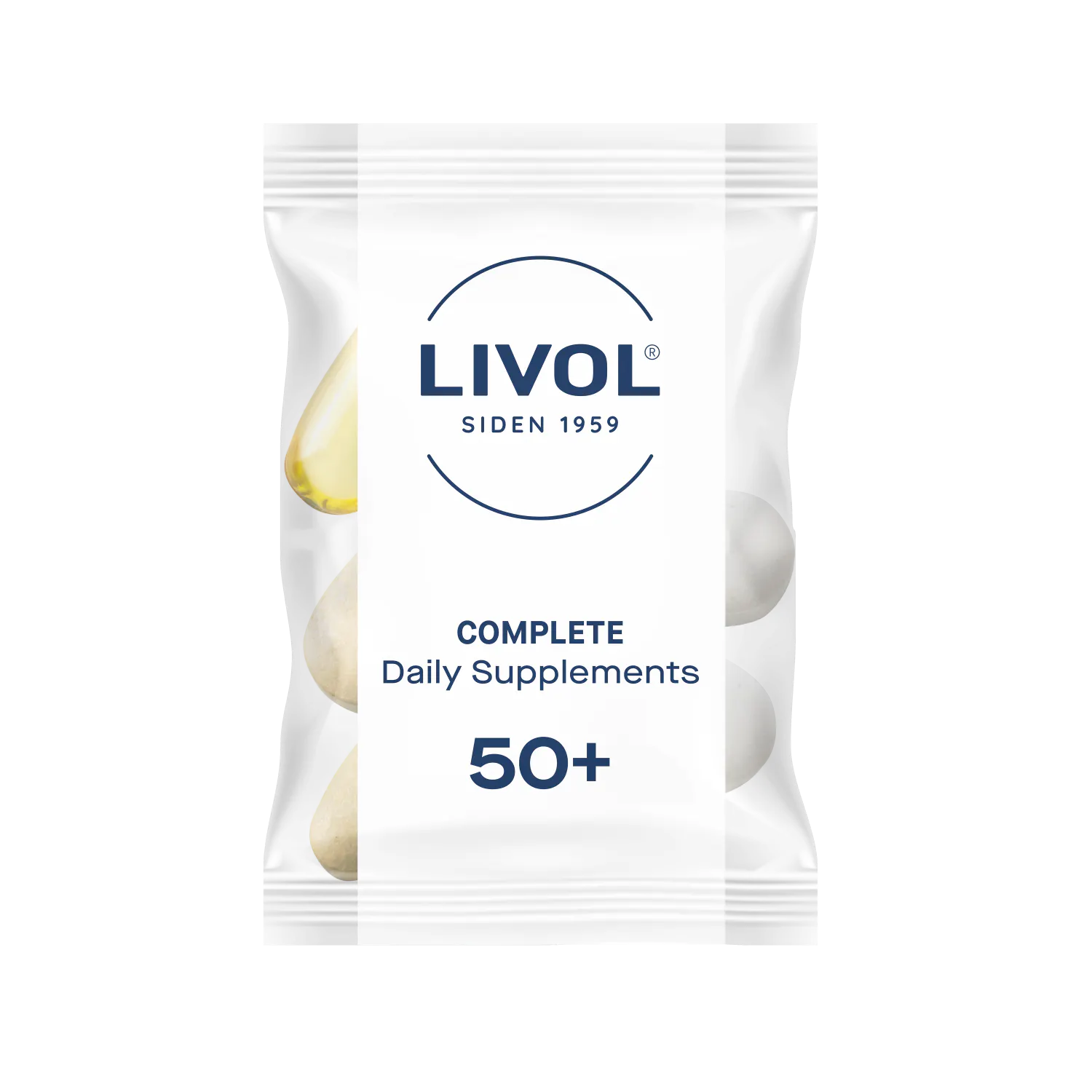 "Med Livol Complete 50+ bliver det enkelt at huske og tage dine daglige kosttilskud. Praktiske dagsposer samler vitaminer, mineraler og omega-3 til dig over 50.