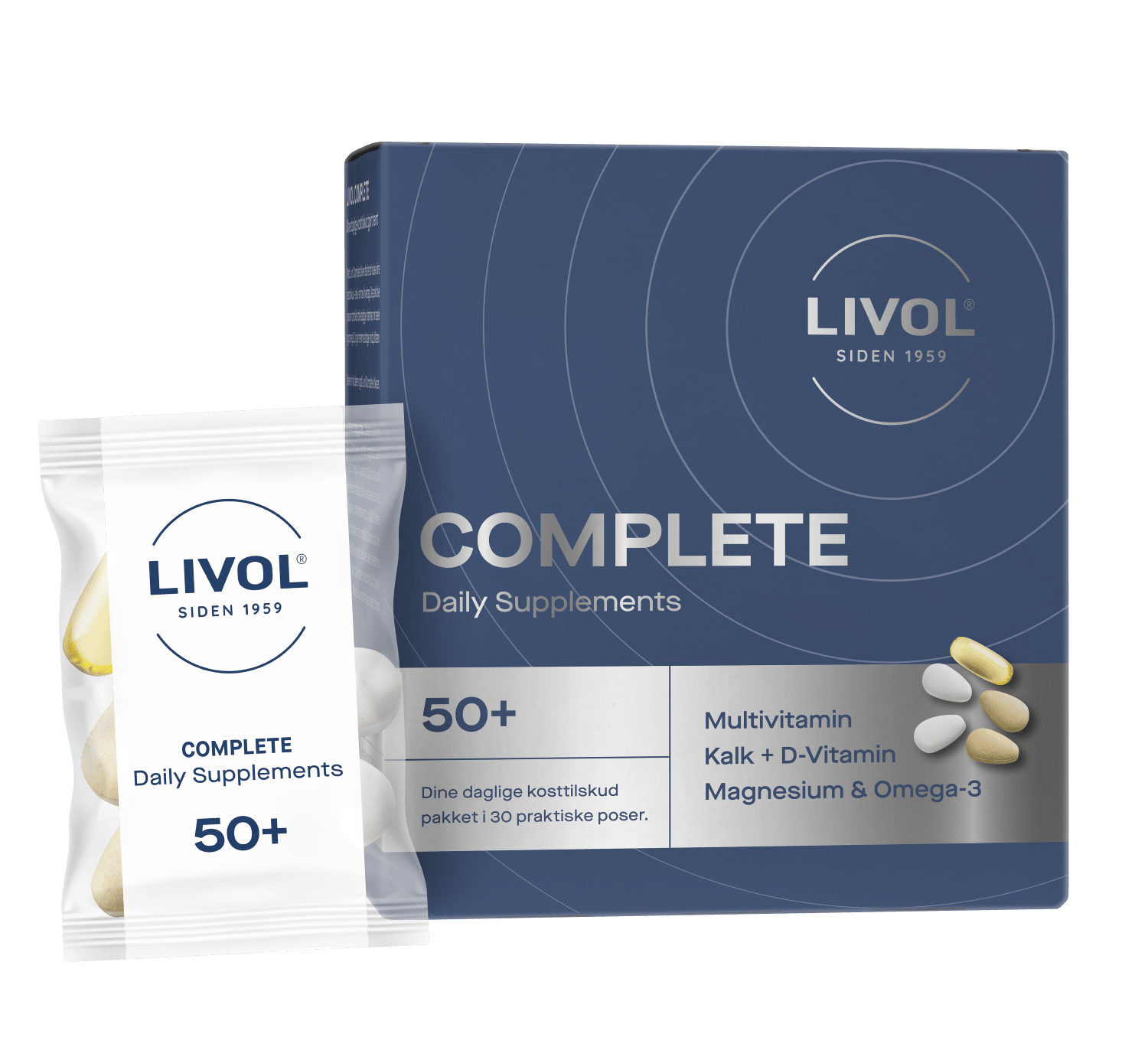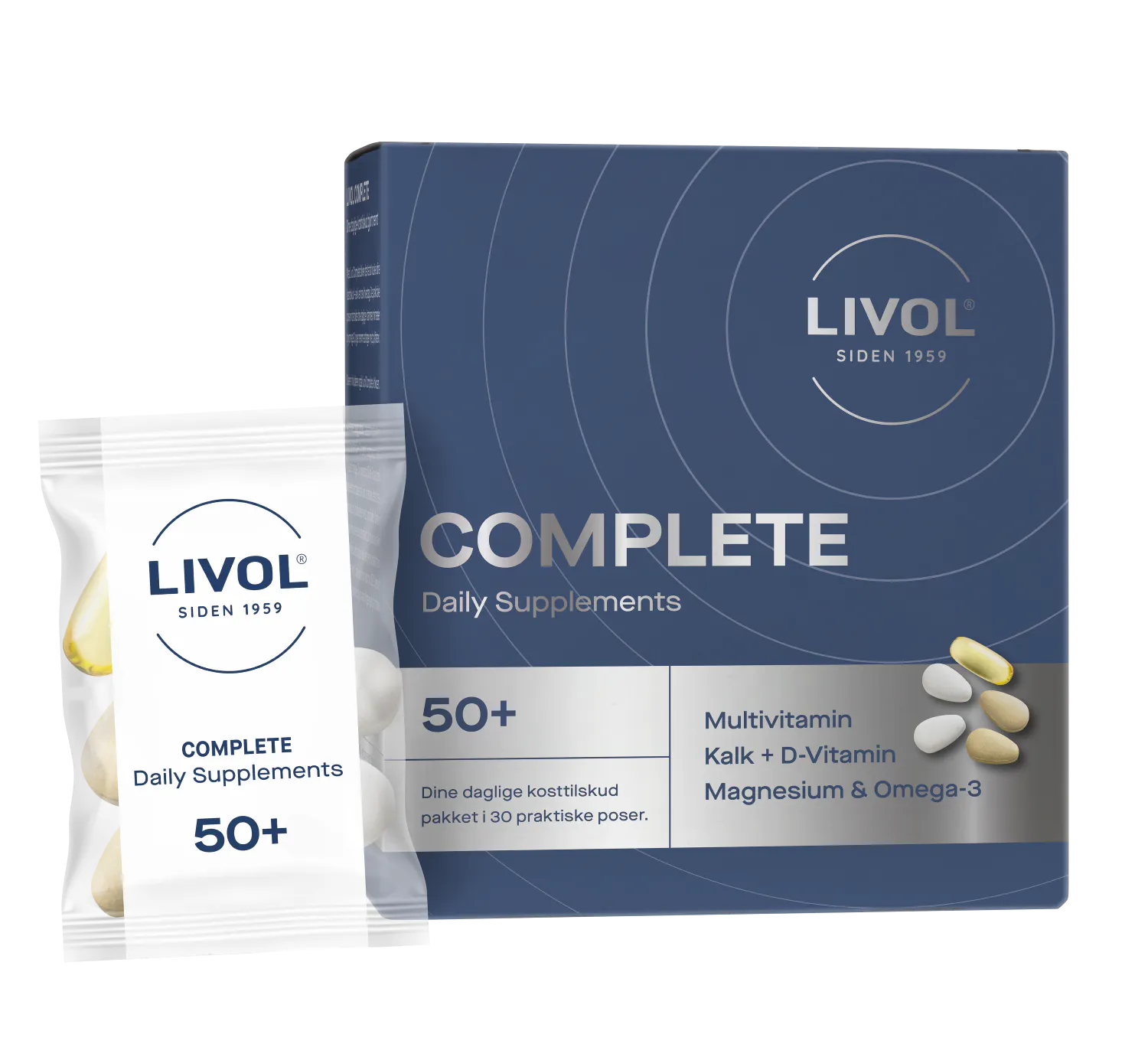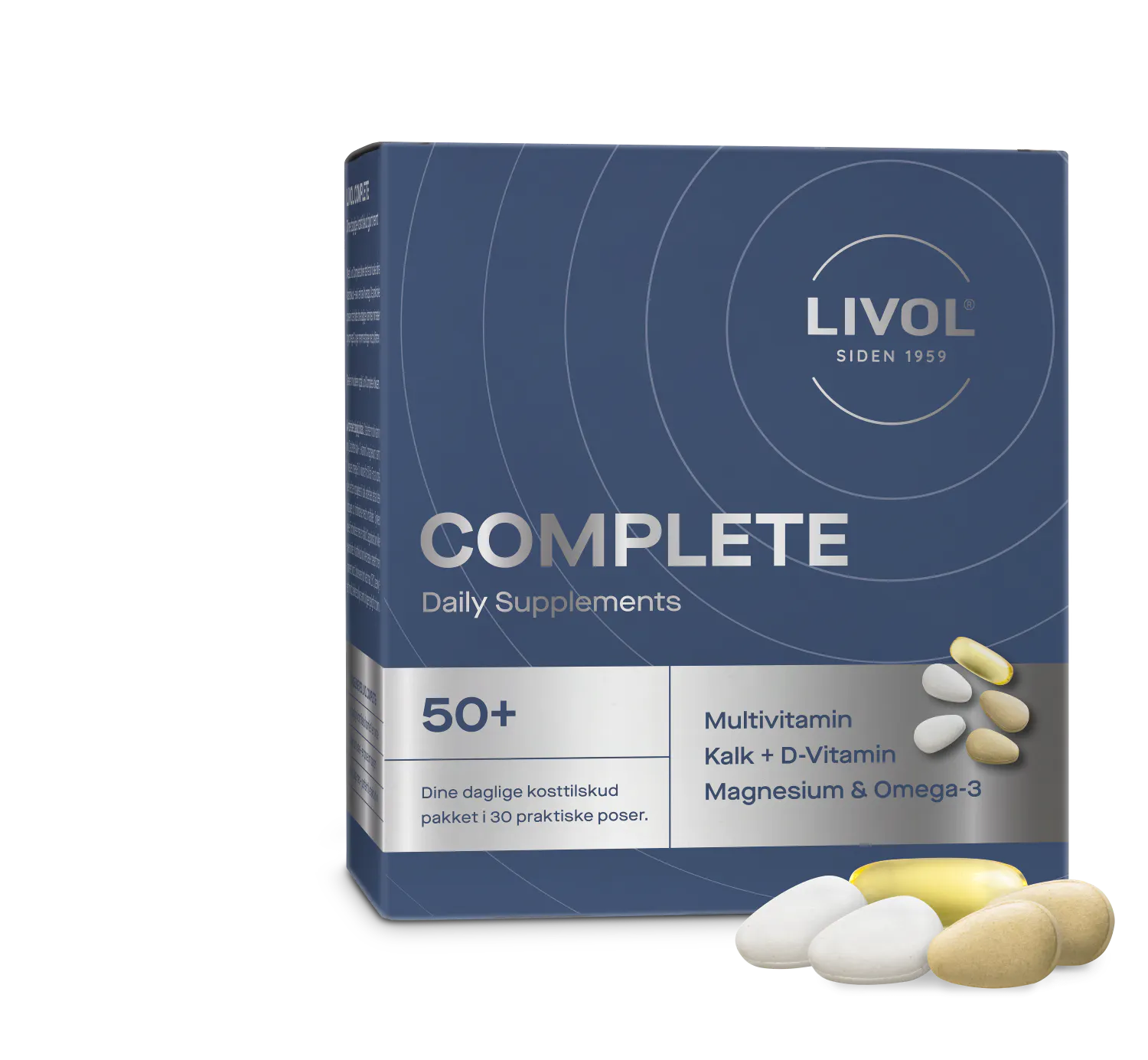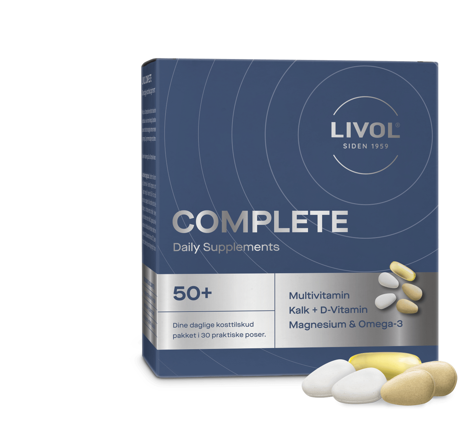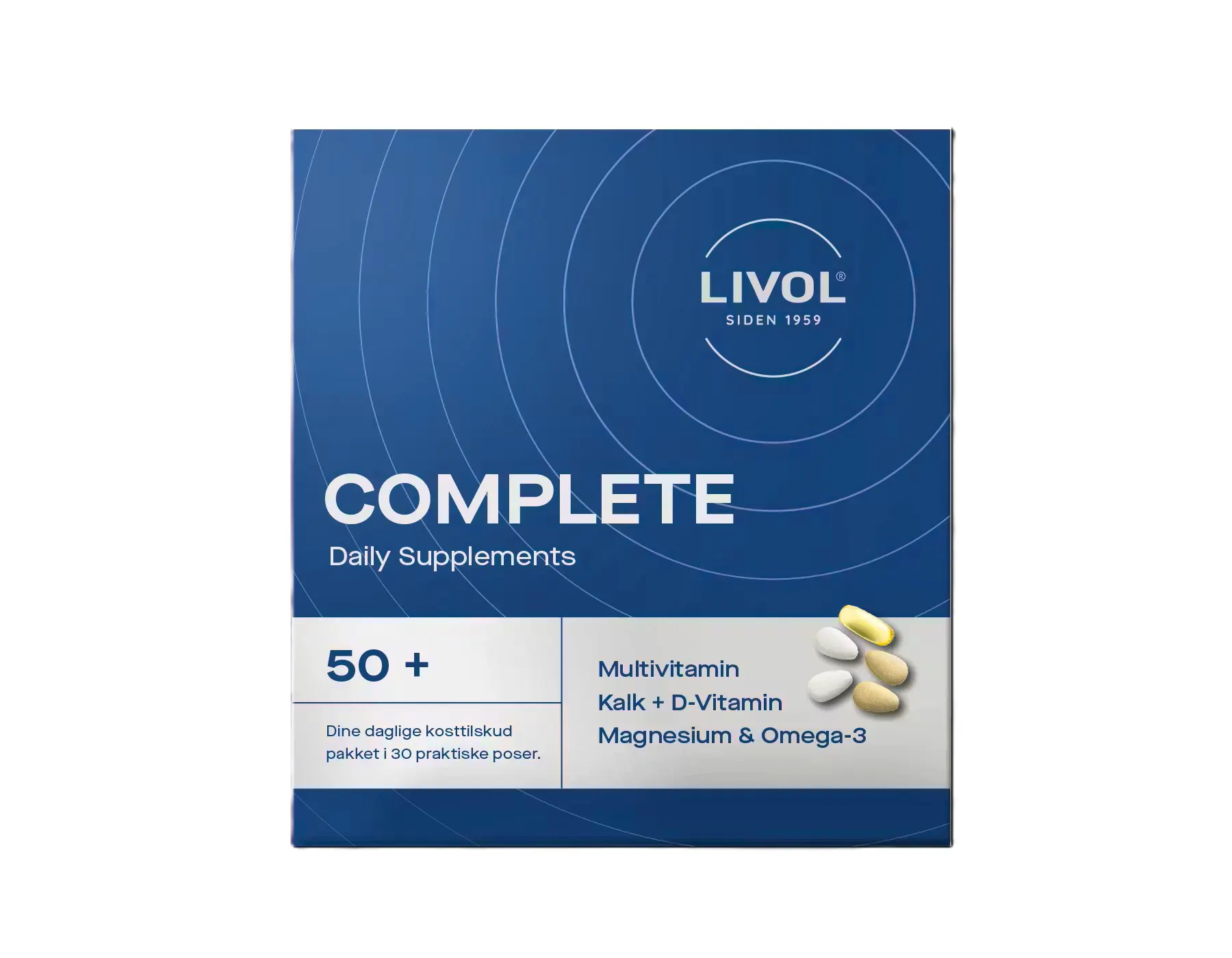 "Med Livol Complete 50+ bliver det enkelt at huske og tage dine daglige kosttilskud. Praktiske dagsposer samler vitaminer, mineraler og omega-3 til dig over 50.