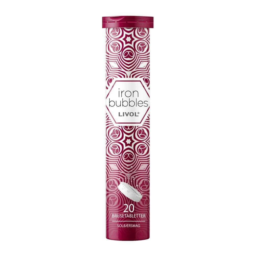 Livol Iron Bubbles Brusetabletter Solbær indeholder 20 brusetabletter og anbefalet indtag er en om dagen.