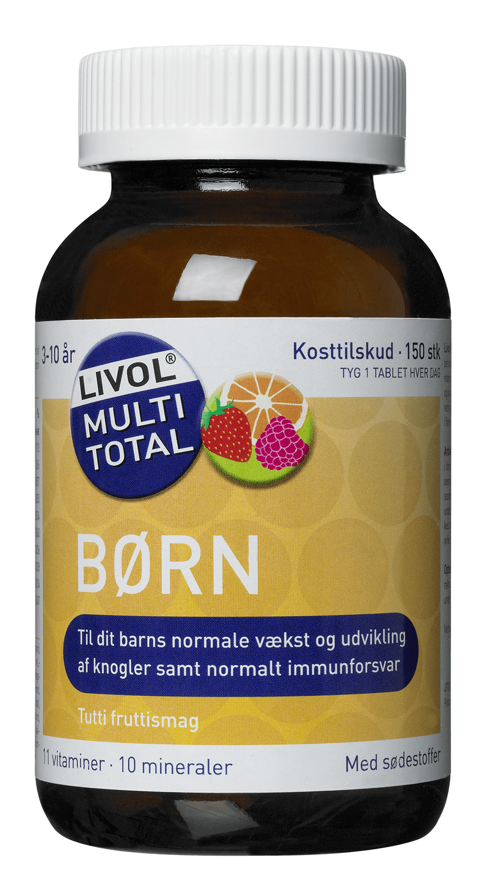 Hvis du vil sikre at dit barn får de rette daglige vitaminer, behøver du blot give en Livol Multi Total Børn Tutti Frutti pille dagligt. Vitaminpillen bør indtages fra barnet er 3 år, og til at de når en alder på ca. 10 år.