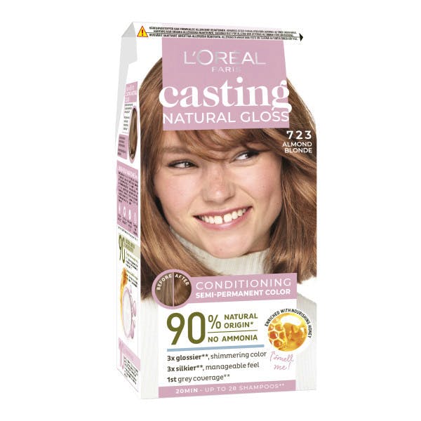 Casting Natural Gloss er en tonende hårfarve med ingredienser af 90% naturlig oprindelse*. Formlen, som er helt uden ammoniak, dækker dine første grå hårstrå** og har en dejlig duft. Den fyldige hårfarve tager hensyn til dit hårs naturlige toner og tekstur for et resultat der ser naturligt ud + giver et synligt sundt resultat med 3X mere glans**. Hurtig og nem at anvende (selv hvis du er nybegynder), og så tager det kun 20 minutter. Toningsfarven er semi-permanent og kommer til at falme hen over 28 hårvaske**. * Ingredienser i hele kittet. ** Instrumentel test efter anvendelse af alle komponenter i hele farvekittet. Anvendelse: For instruktioner om hvordan produktet skal anvendes, se venligst brugsanvisningen i pakken.