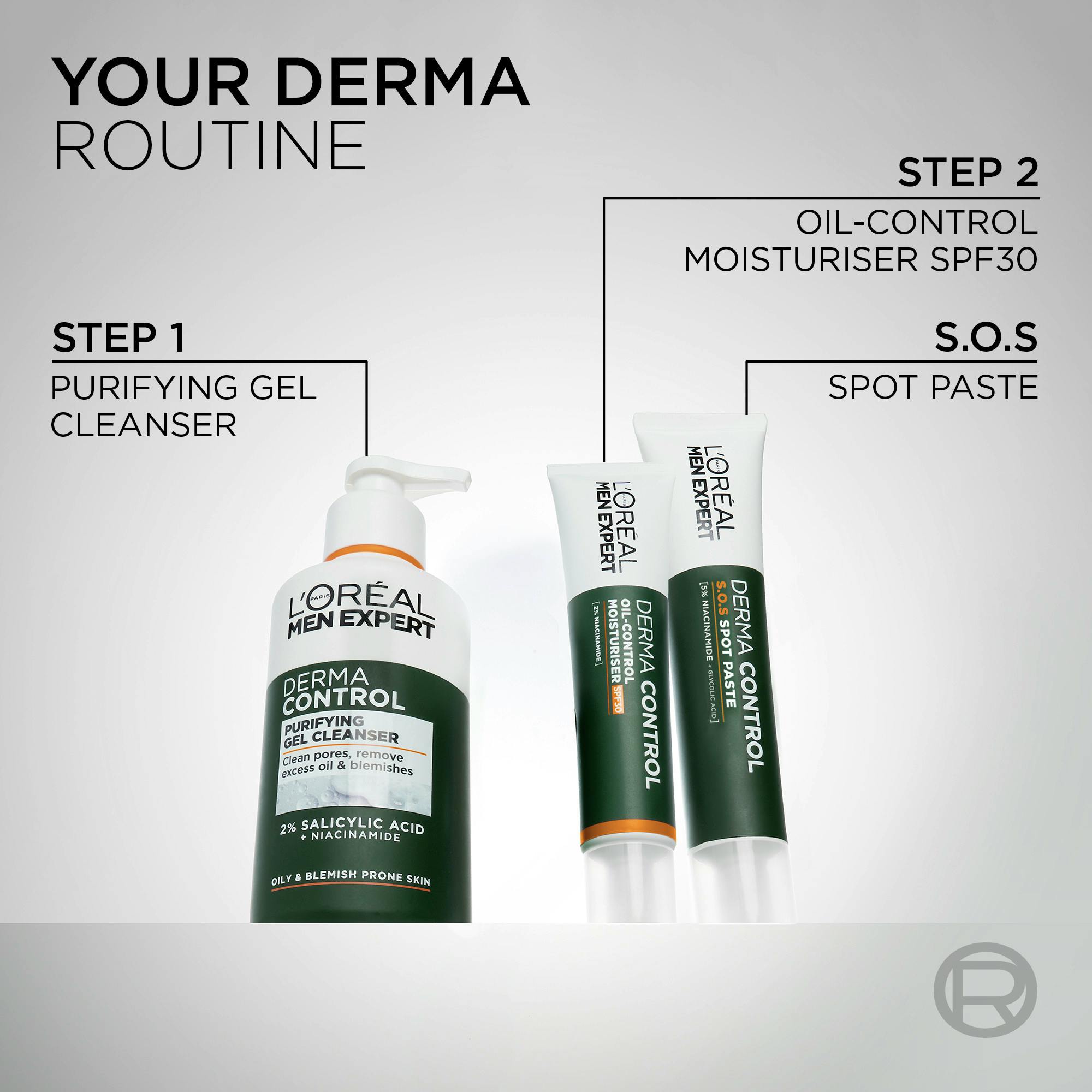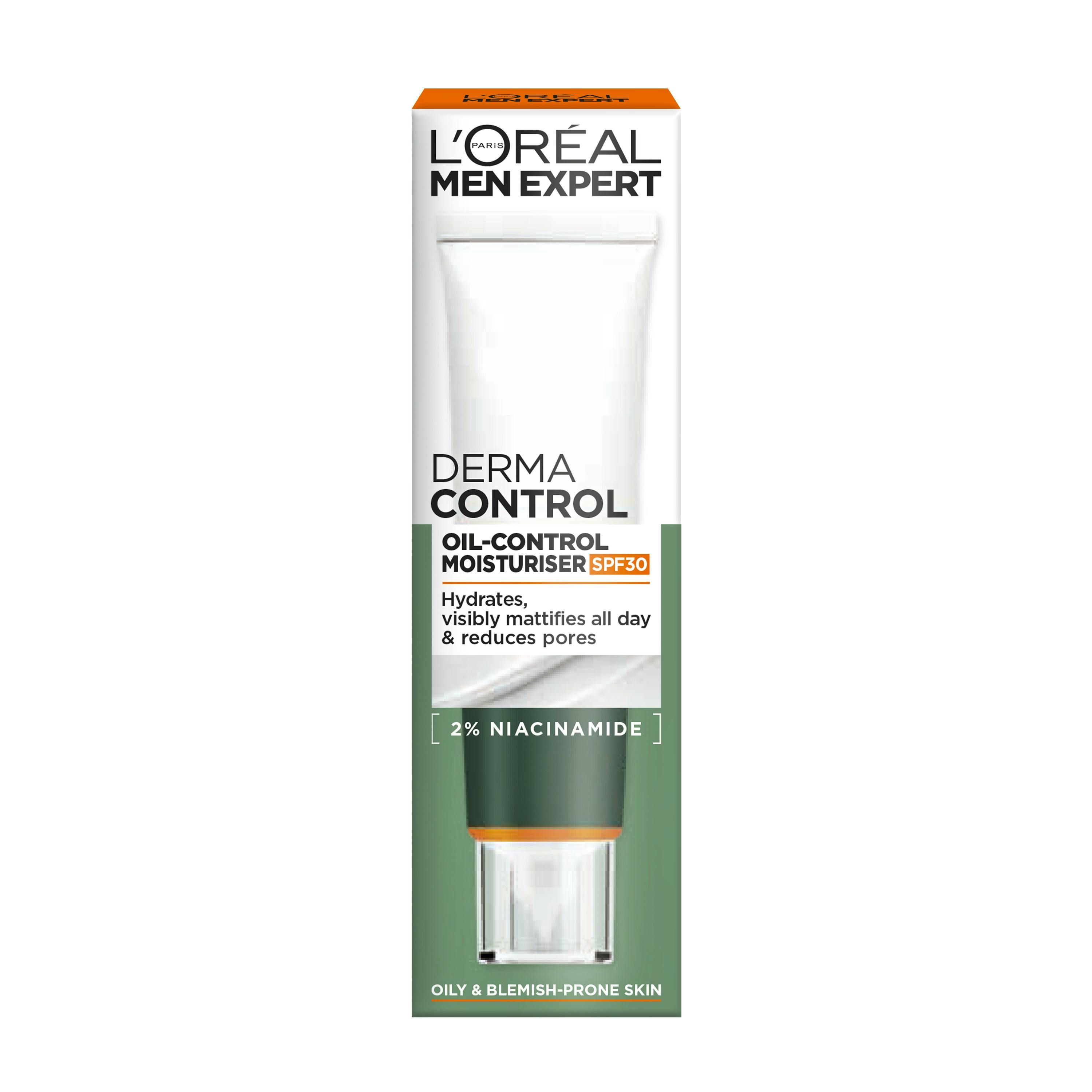 L'Oréal Paris Men Expert Derma Control SPF30 Oil-Control Moisturiser er en ansigtscreme med niacinamid til alle hudtyper, Formlen beskytter din hud med SPF30, kontrollerer hudens produktion af olie, fugter, reducerer porer samt får din hud til at føles jævn og spændstigere, Velegnet til sensitiv hud,Undgå øjenområdet, Skyl straks med rigeligt vand ved kontakt med øjnene, Husk at anvende solbeskyttelse hvis du skal opholde dig længe i solen,Fuldend din rutine med rensegel og S,O,S Spot Paste i samme serie, • Beriget med niacinamid,• Kontrollerer hudens olieproduktion,• Fugter,• Reducerer porer,• SPF30,• Matterende,• Til alle hudtyper, også sensitiv hud,• Efter 1 anvendelse: Huden føles jævn og spændstigere*,• Efter 7 dage: Fedtet hud er velbalanceret og ser sund ud*, *Forbrugertest, 85 personer, Ved intens eller langvarig solbeskyttelse, brug en passende solcreme,