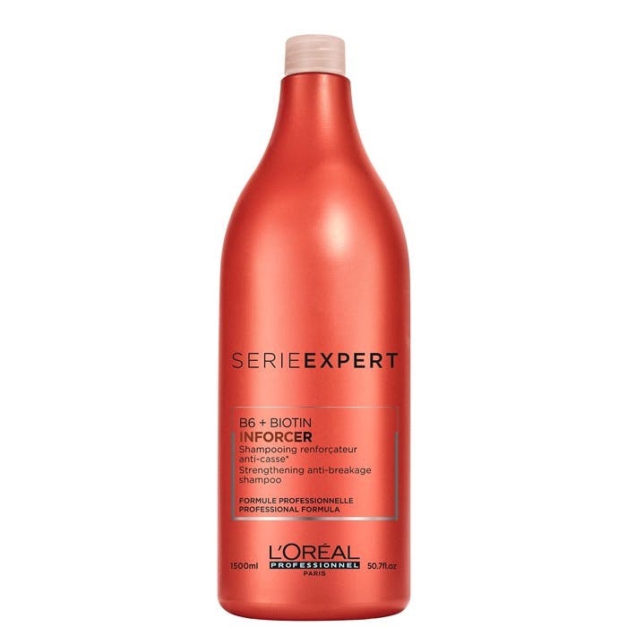 L'Oreal Serie Expert B6+ Biotin Inforcer Shampoo er en reparerende og styrkende shampoo, der indeholder vitamin B6 og Biotin, som bidrager til at reparere, pleje og styrke håret. Shampooen efterlader håret mere modstandsdygtigt, glattere og mere håndterbart, samtidig med at den hjælper med at reducere at håret knækker. Du vil opleve et mere glansfuldt hår, som er beskyttet mod yderligere slitage og skader. Indeholder 1500 ml.